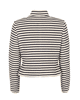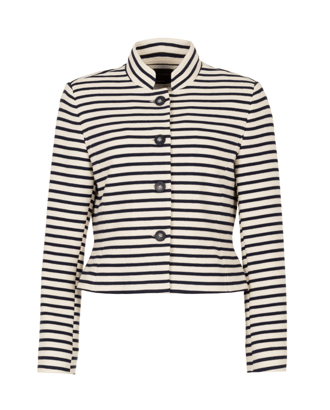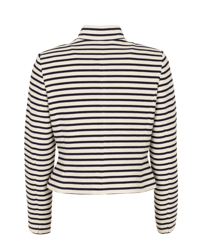 De combinatie van horizontale strepen, een korte snit en opstaande kraag maakt deze blazer zowel speels als gekleed. Ideaal voor lente en zomer.
