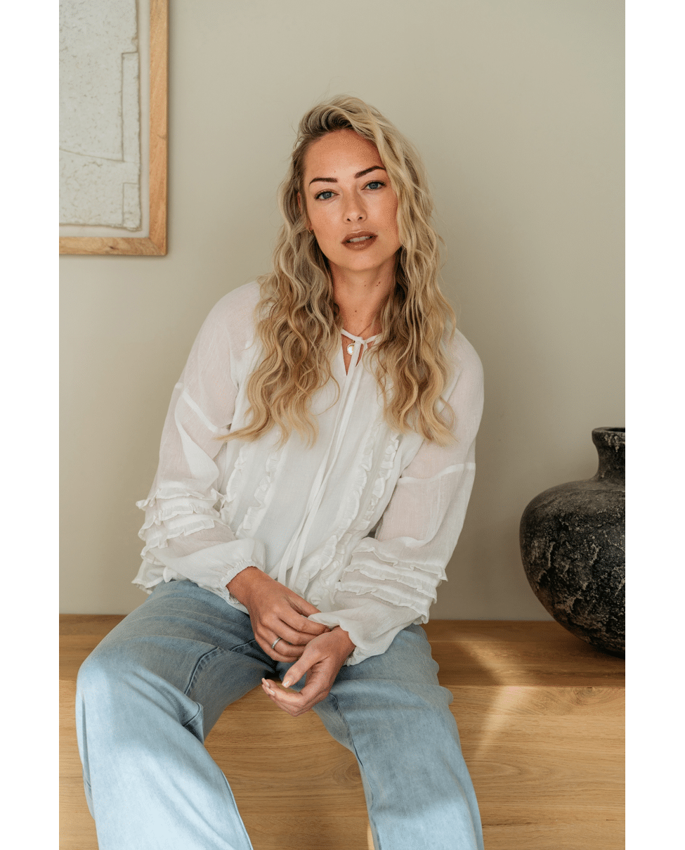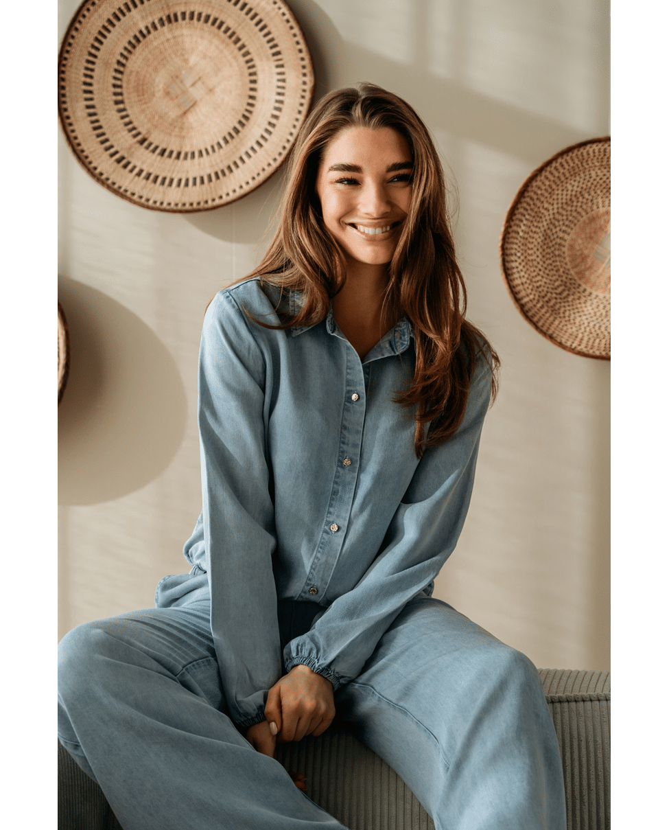 Gemaakt van 100% lyocell. Dit materiaal voelt zacht aan, valt soepel en heeft een ademend karakter, ideaal voor warmere dagen.