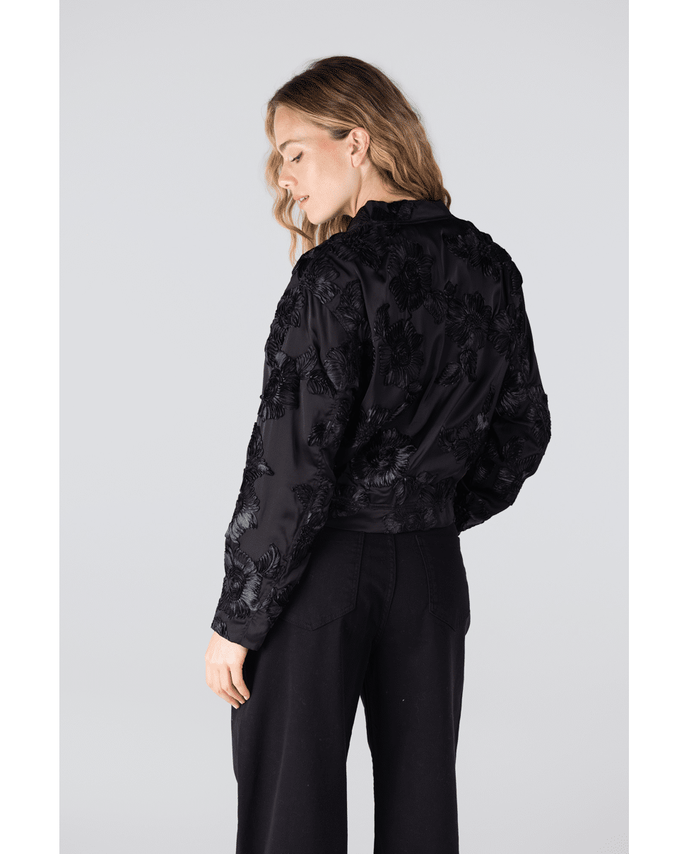 Een vrouwelijke bomber met een twist. Dit zwarte bomberjack met bloemenborduursels geeft je look direct iets bijzonders. Gemaakt voor herfstige dagen waarop je net wat extra flair wil.
