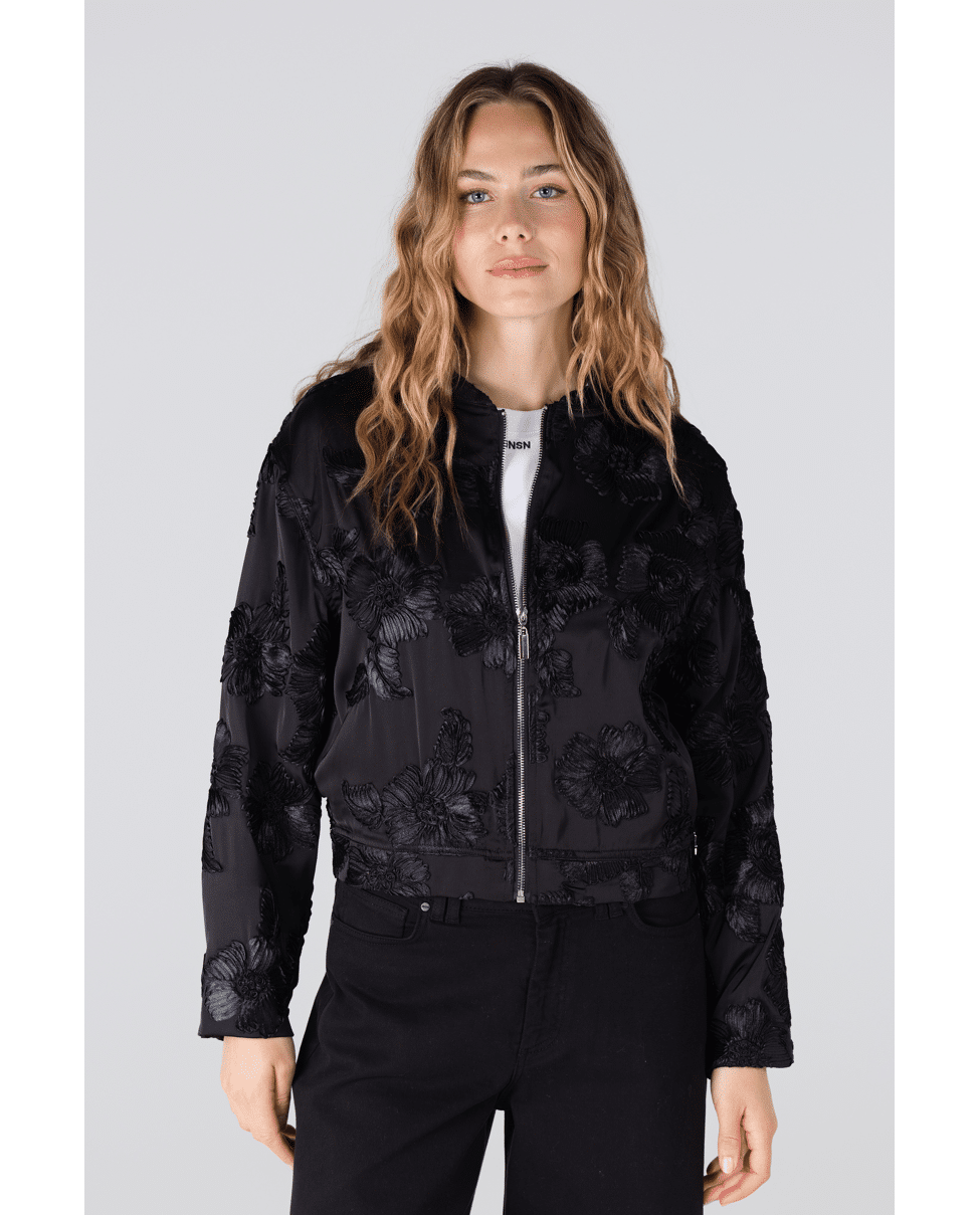 JILL W25.4 - dames bomberjasje van Jansen met geborduurde bloemen, ritssluiting, elastiek in de zoom en lange mouwen