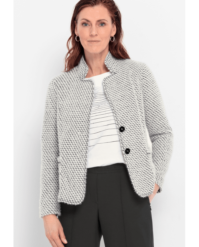 Deze blazer met grafisch patroon is een stijlvolle keuze voor werk of een nette gelegenheid. De opstaande kraag en getailleerde snit zorgen voor een moderne, vrouwelijke look.