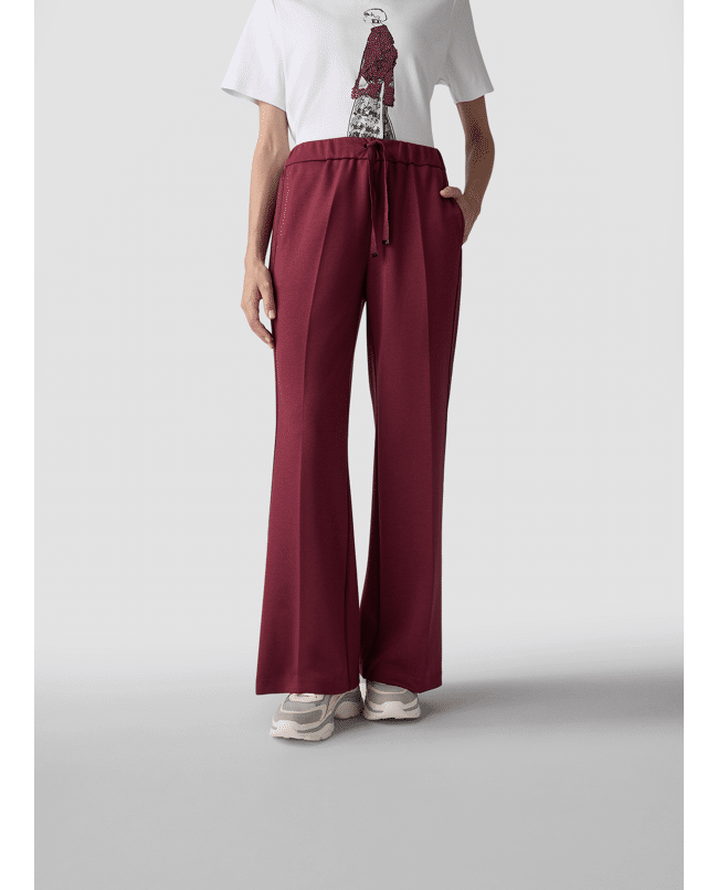 Comfort en stijl komen samen in deze soepelvallende broek van Rabe. Met zijn rechte pijpen, strikkoord en glitterbies aan de zijkant is dit een ontspannen keuze voor dagelijks gebruik of een casual chic look.