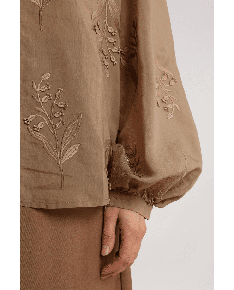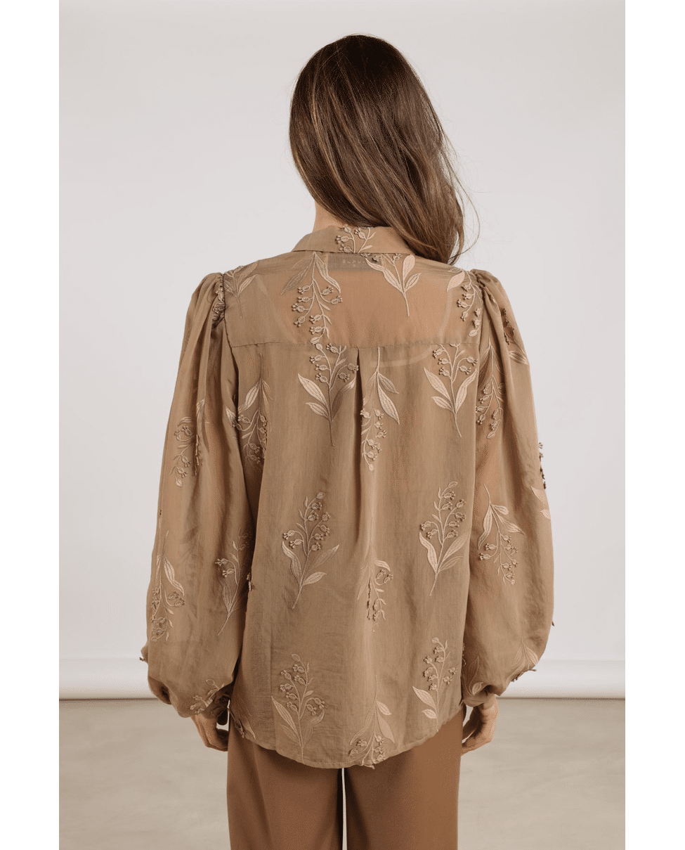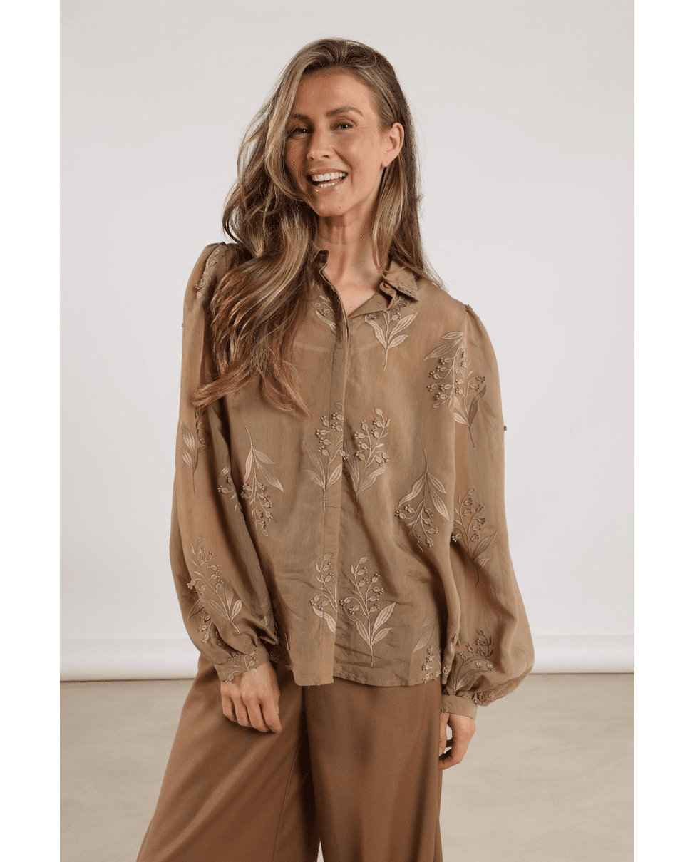 Een camel blouse met vrouwelijke flair. Afgewerkt met bloemenborduursel en een klassieke overhemdkraag – ideaal voor zowel werk als weekend.De Jolies Blouse Embroidery is een stijlvolle blouse met subtiele borduursels die iedere outfit een chique uitstraling geven. Combineer met een pantalon voor een elegante look, perfect voor zowel werk als speciale gelegenheden.