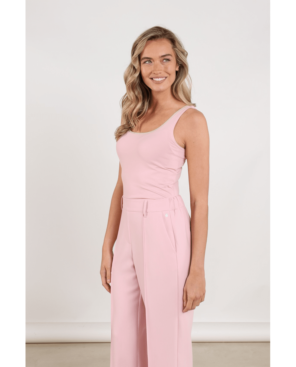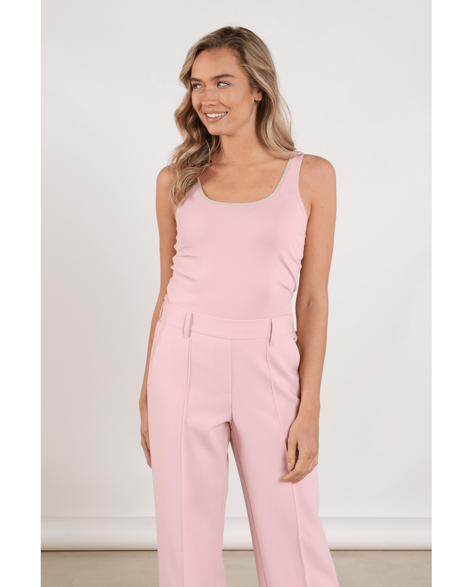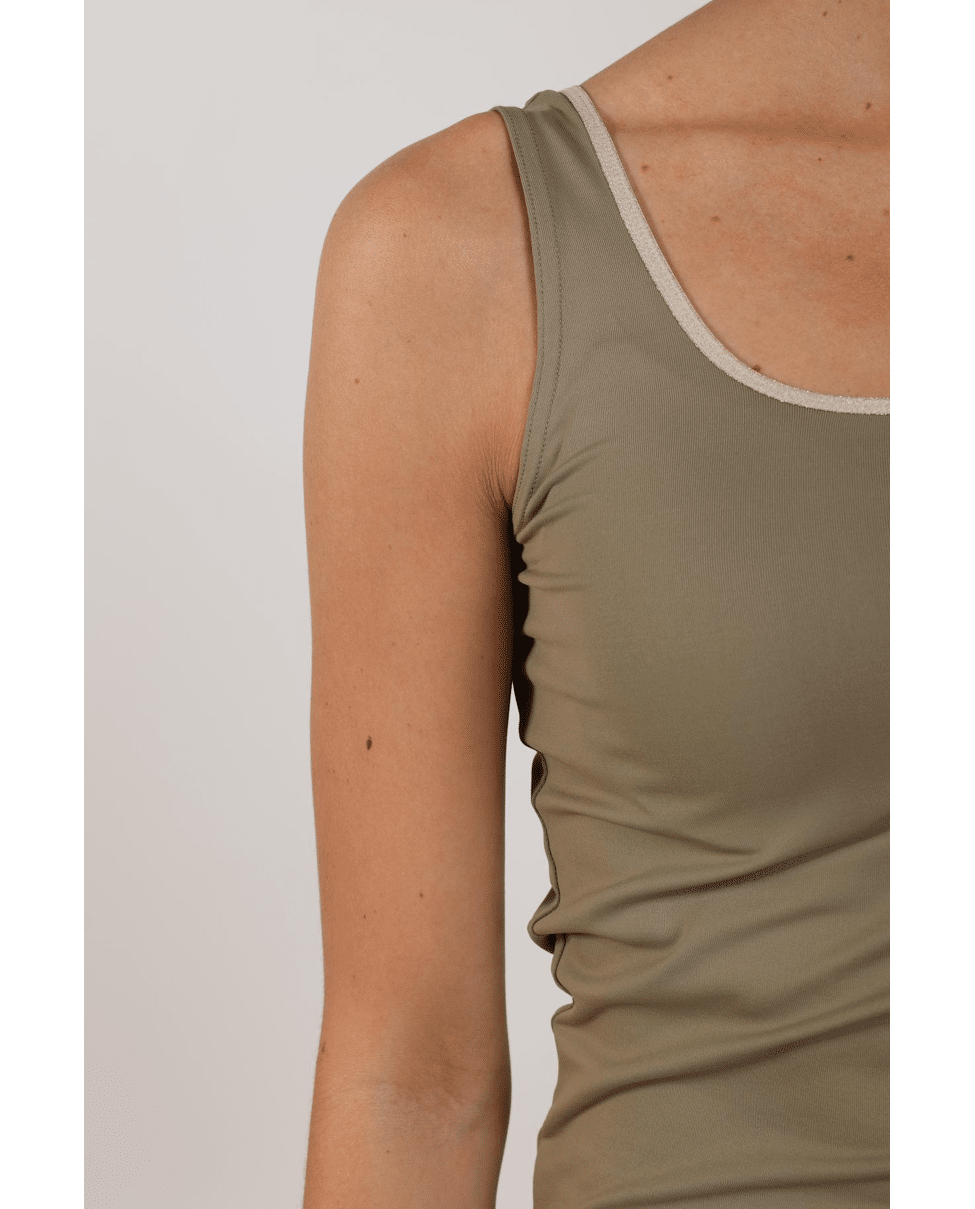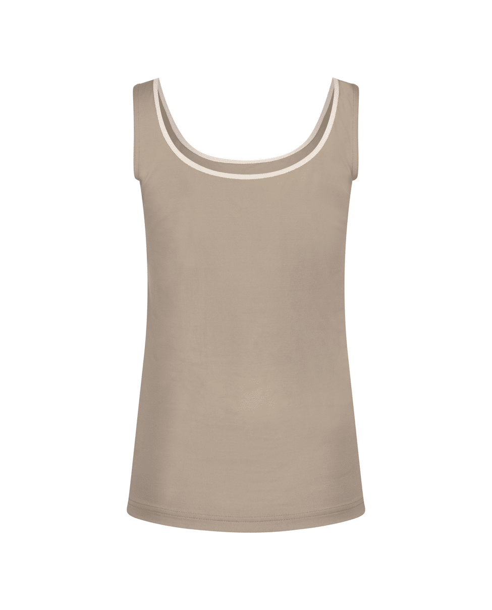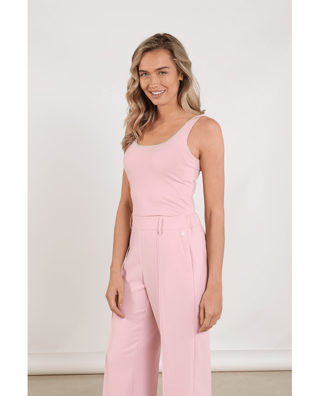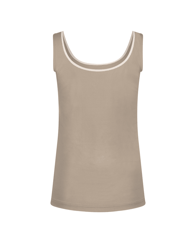 Juba – Effen dames basis singlet van Nukus met lurex randje, brede bandjes en ronde halslijn