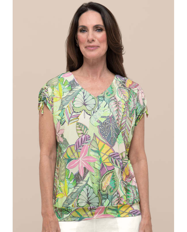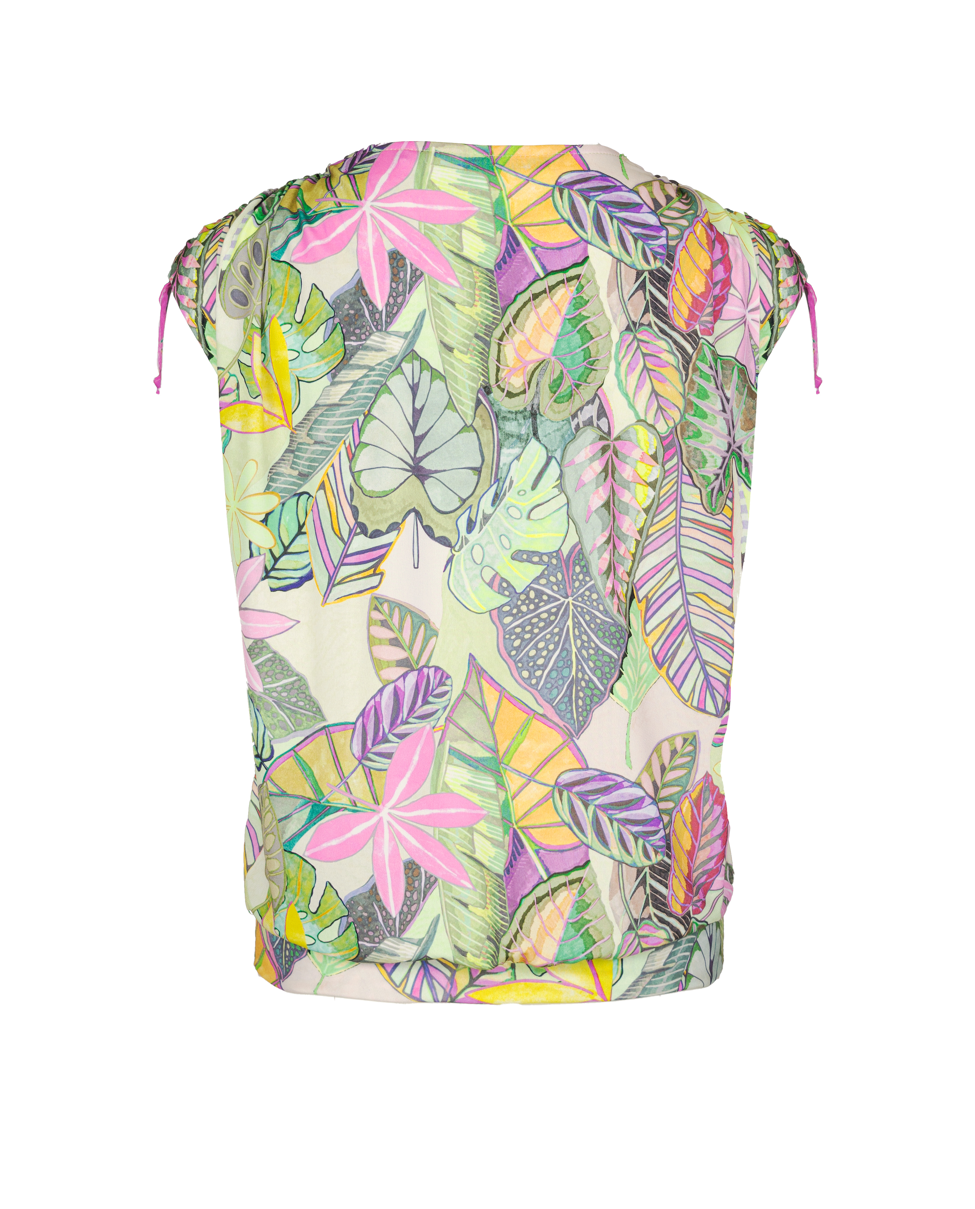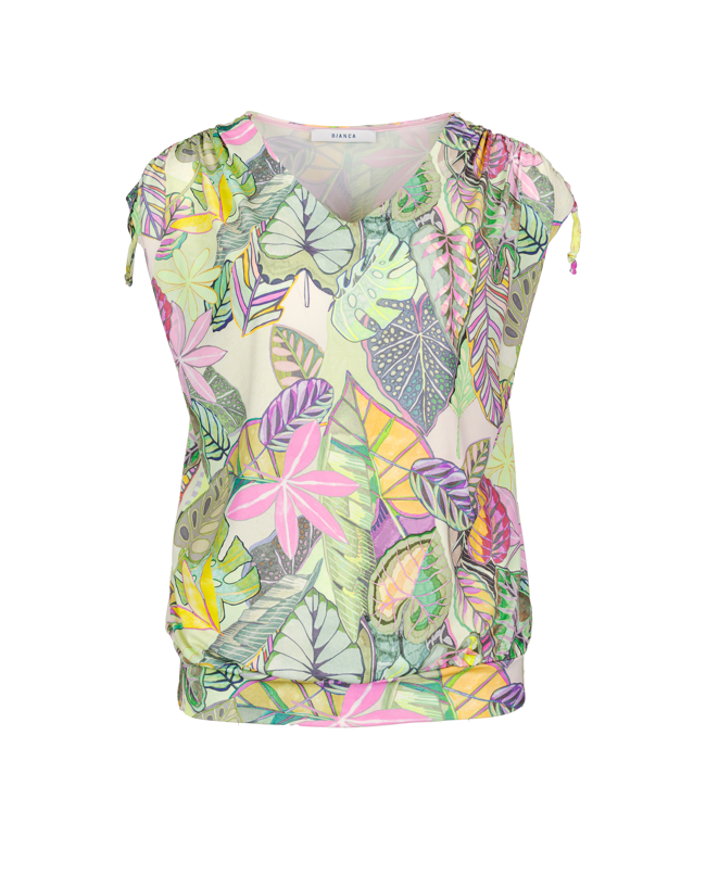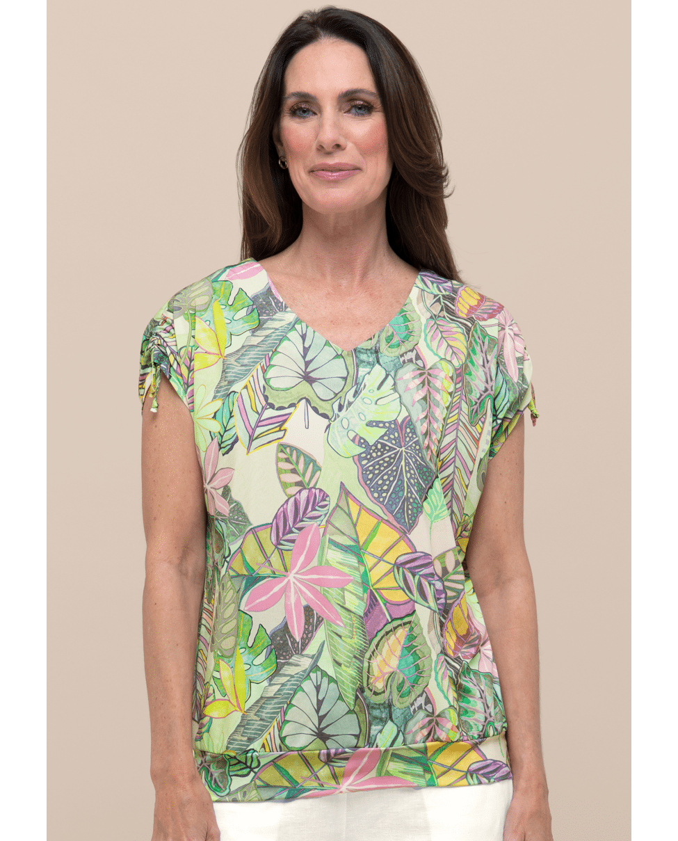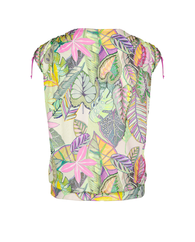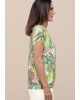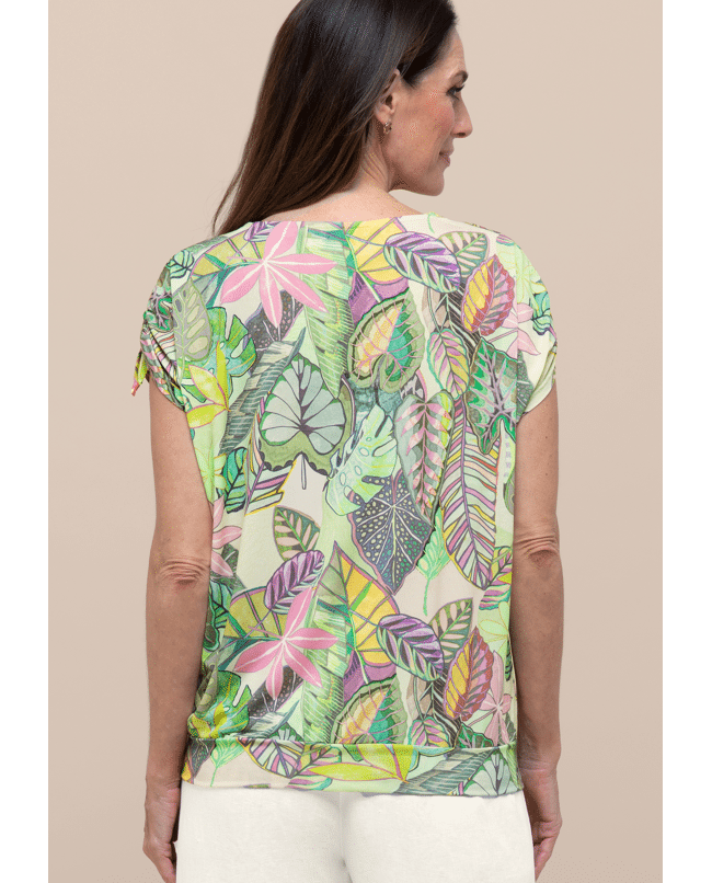 De combinatie van de levendige bladerenprint en de speelse striklintjes aan de mouwen maakt dit shirt vrouwelijk en net even anders. Comfort en flair in één.