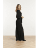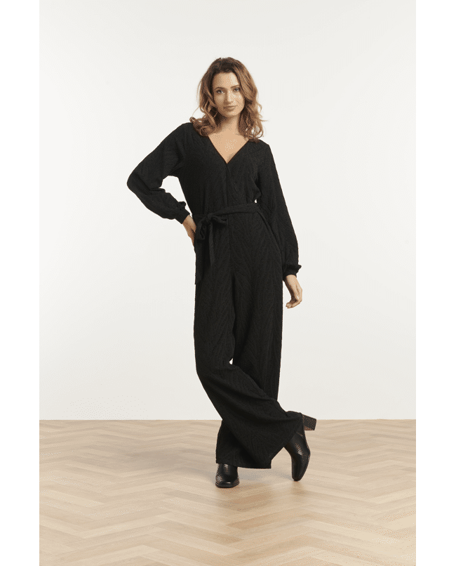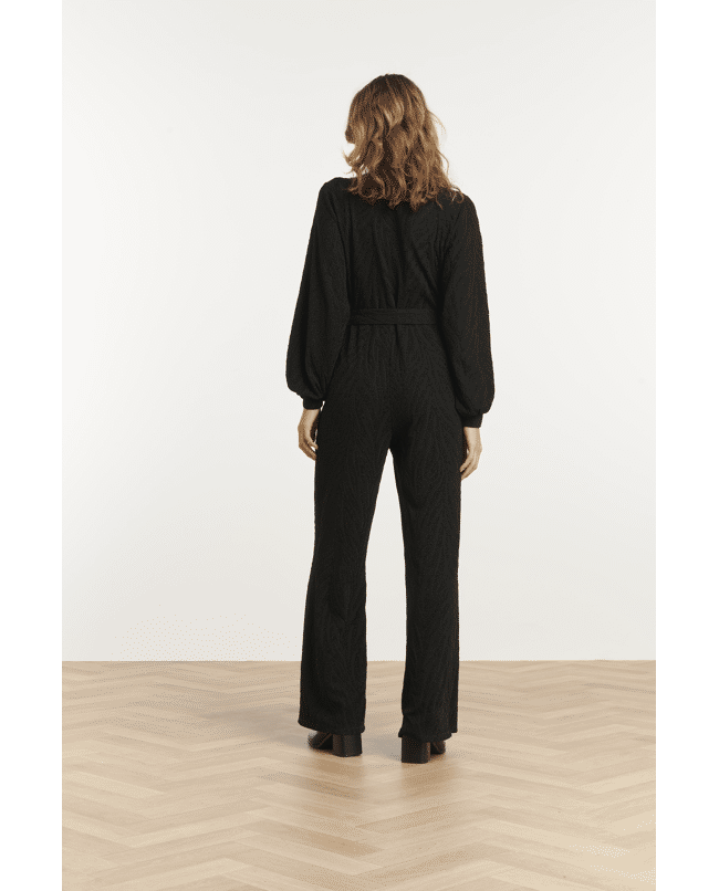 Zwarte dames jumpsuit van Smashed Lemon met glanzende dieren print, V-hals, strikceintuur, wijde pijpen en lange mouwen