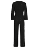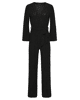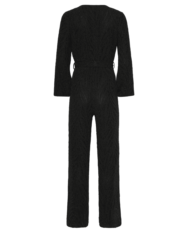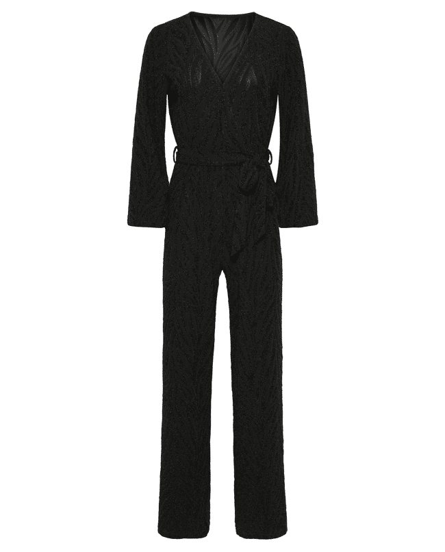 Deze zwarte jumpsuit met glanzende dierenprint is perfect voor een avondje uit of een feestelijke gelegenheid. De combinatie van V-hals, strikceintuur en wijde pijpen geeft een vrouwelijk en krachtig silhouet.