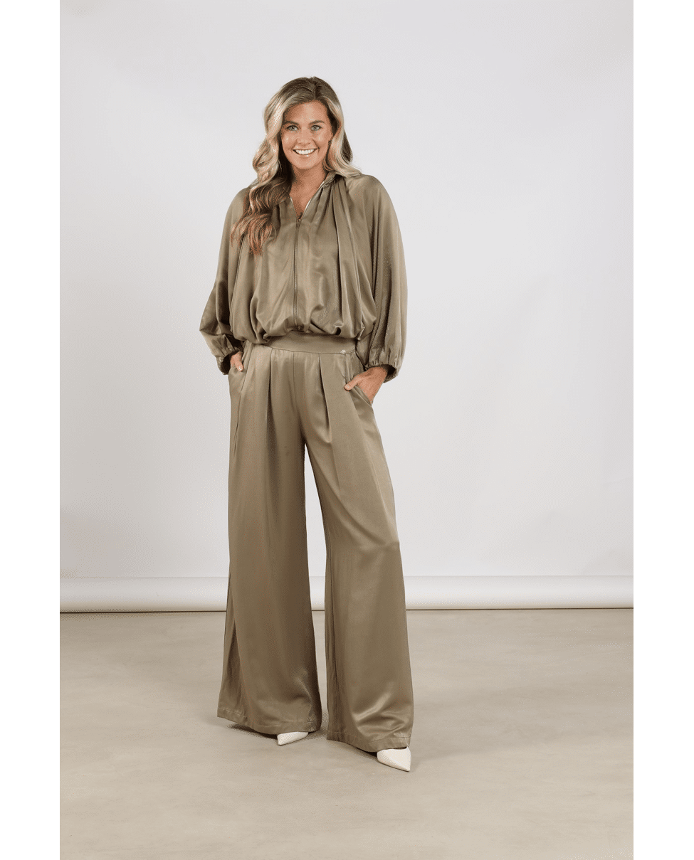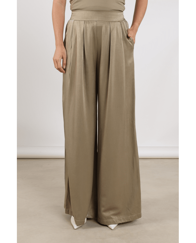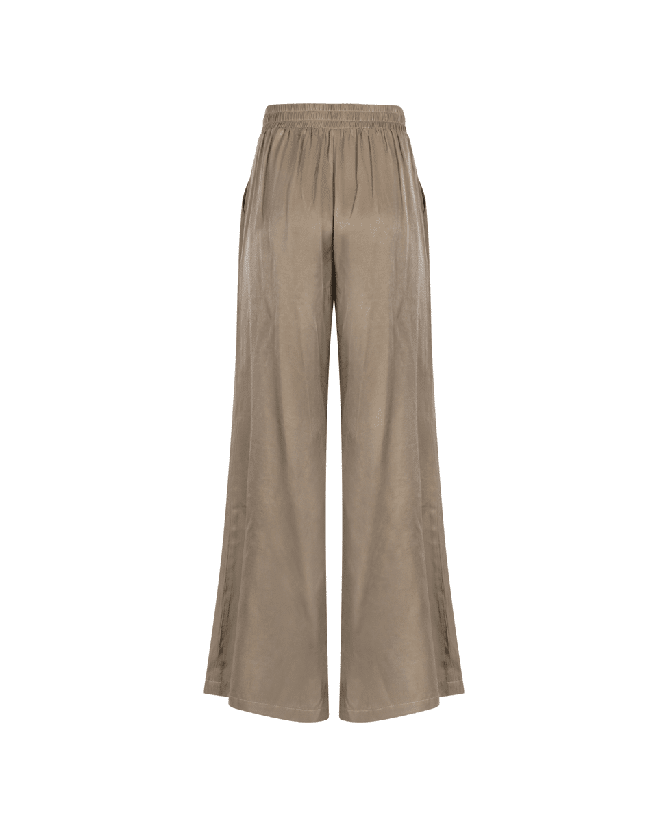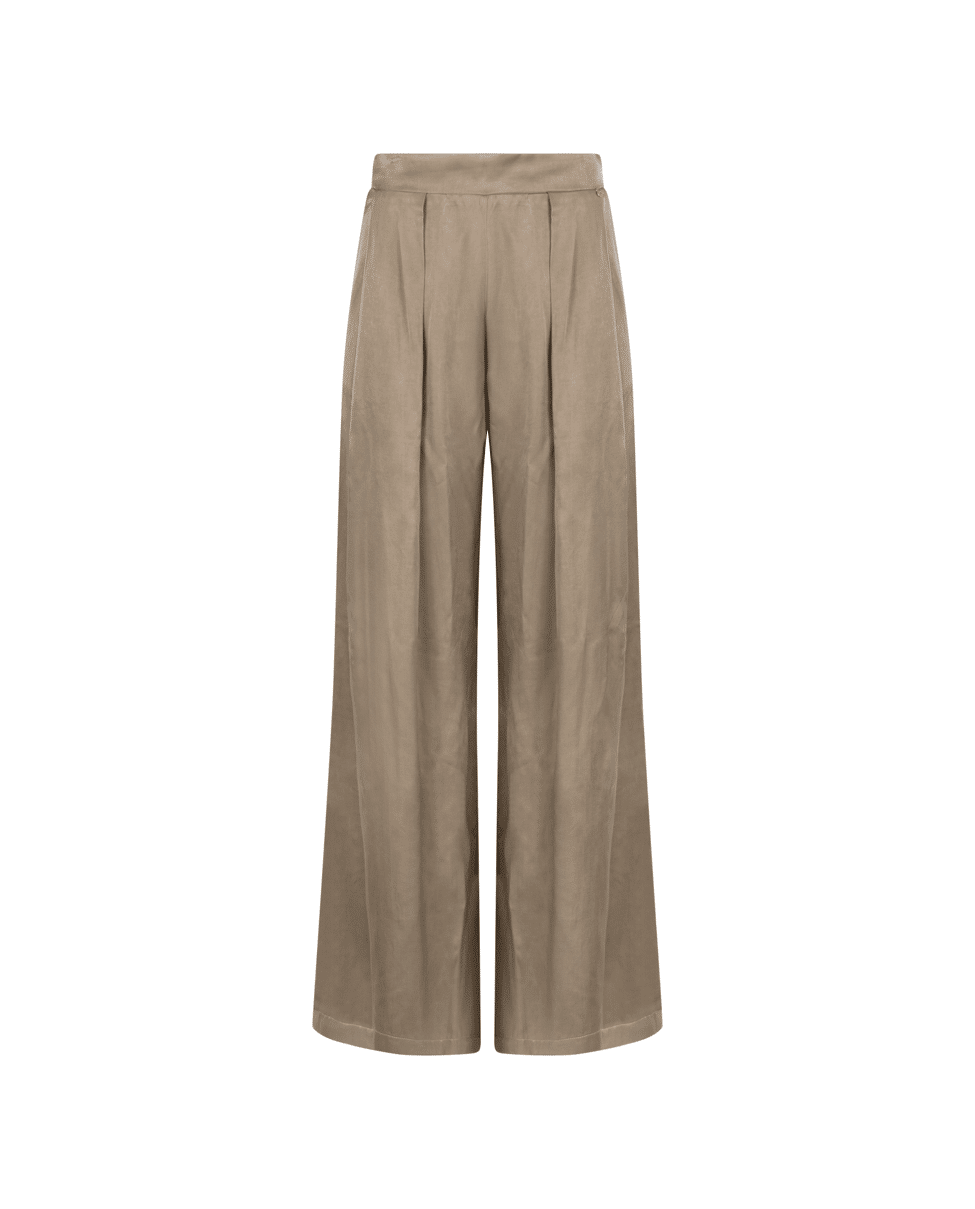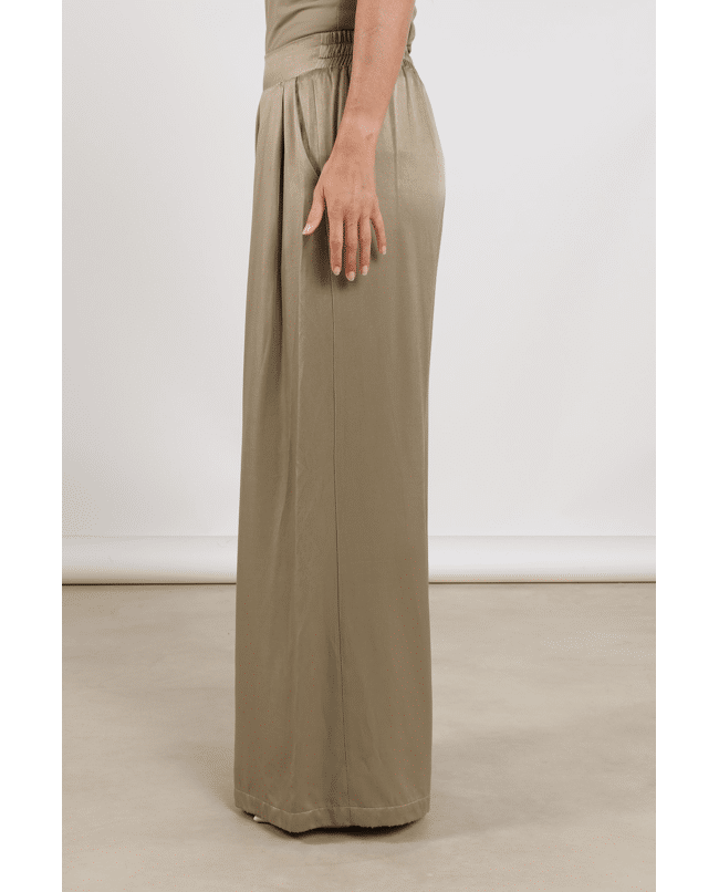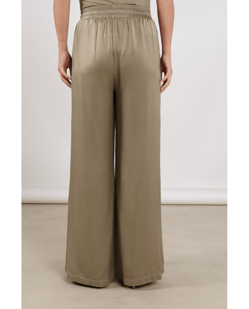 Juna Pants – Satijnlook damesbroek van Nukus met elastische tailleband en wijde pijpen
