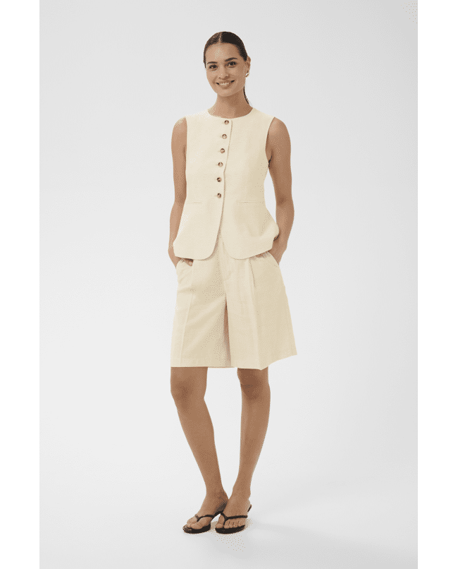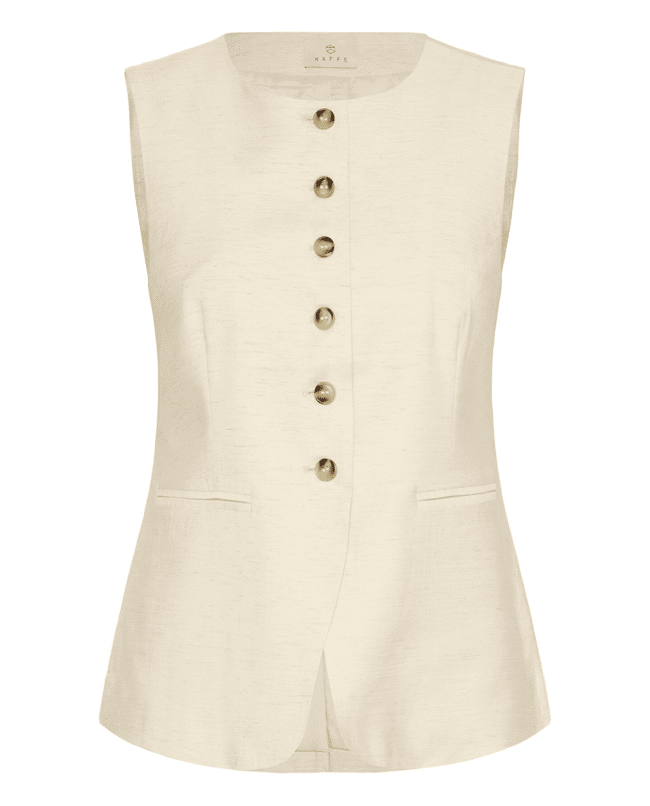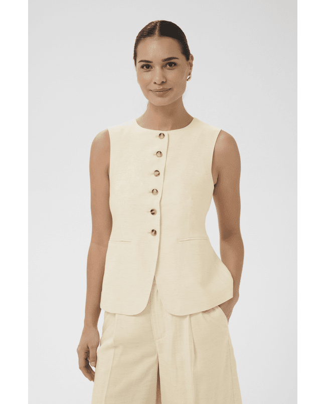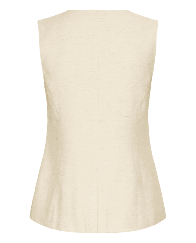 Het subtiele linnengevoel en het vrouwelijke silhouet maken deze waistcoat perfect voor zowel casual chic als smart summer looks.
