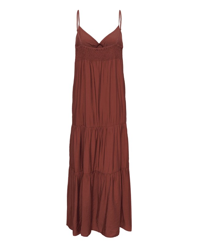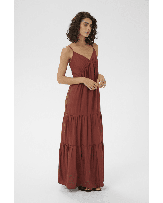De KAxelia Dress is een lange jurk met smalle bandjes en een speels A-lijn silhouet. Licht, luchtig en ideaal voor warme dagen of je vakantiekoffer.