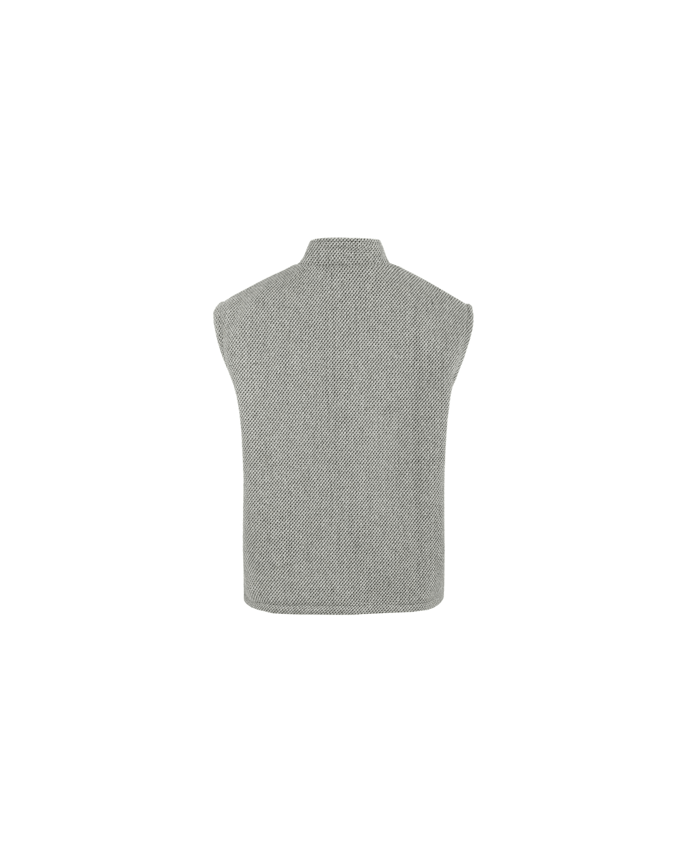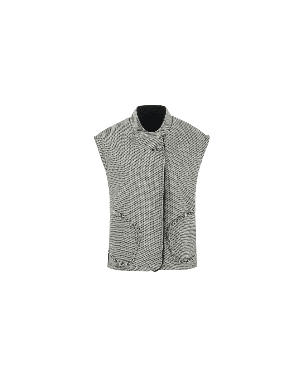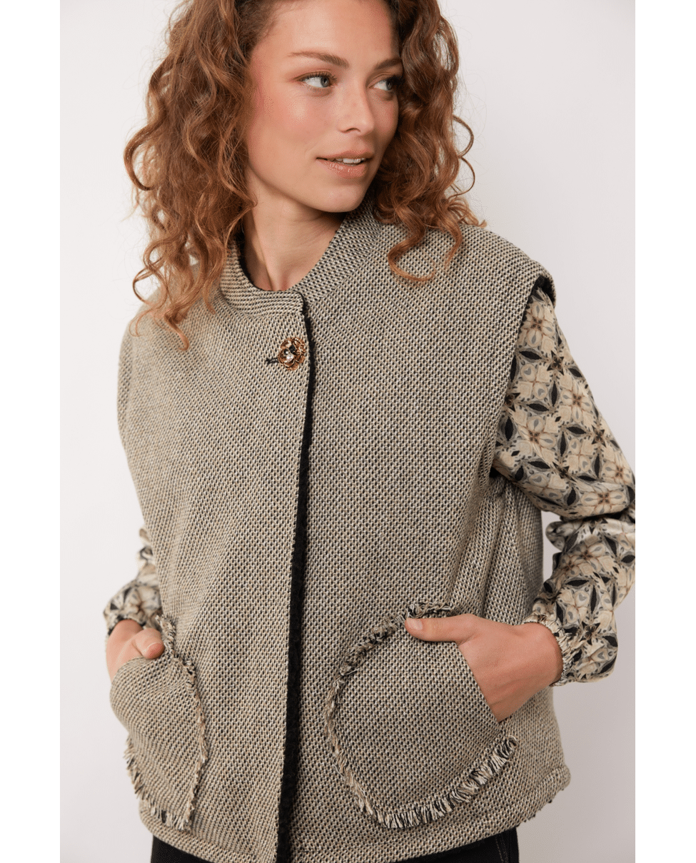 Dit mouwloze item is uitgevoerd in een verfijnde geweven stof met een subtiel visgraatpatroon. De sierlijke randen en het opvallende knoopdetail bij de hals geven het gilet een elegante uitstraling. De afgeronde zakken aan de voorzijde zorgen voor een speelse twist.
