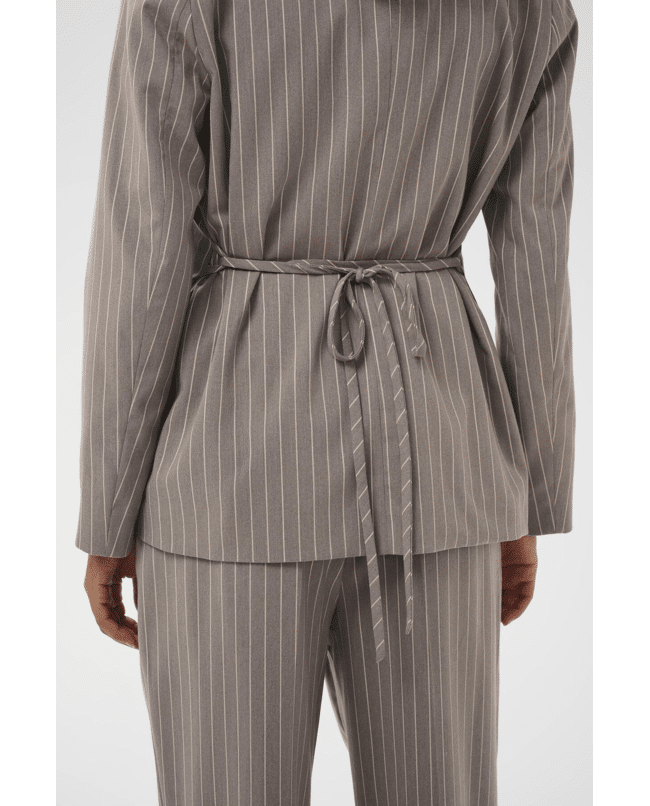 Stijlvolle damesblazer met krijtstreep, ontworpen met oog voor detail en comfort. Voorzien van handige zakken, een strikriem in de taille en een enkele knoopsluiting voor een elegante en vrouwelijke pasvorm.