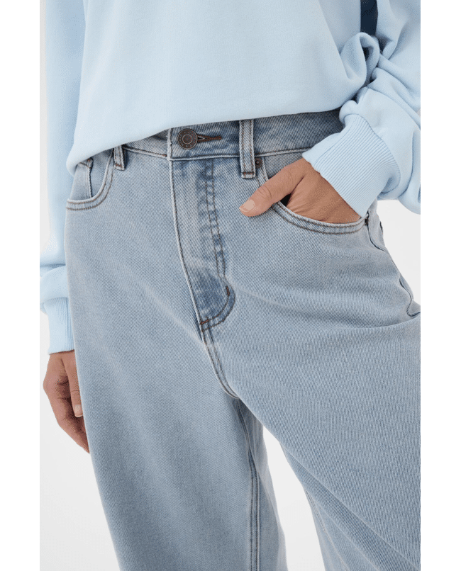 Loose fit met barrel-leg: wijd bij dij en knie, smal naar de enkel. Hoge taille accentueert de taille.