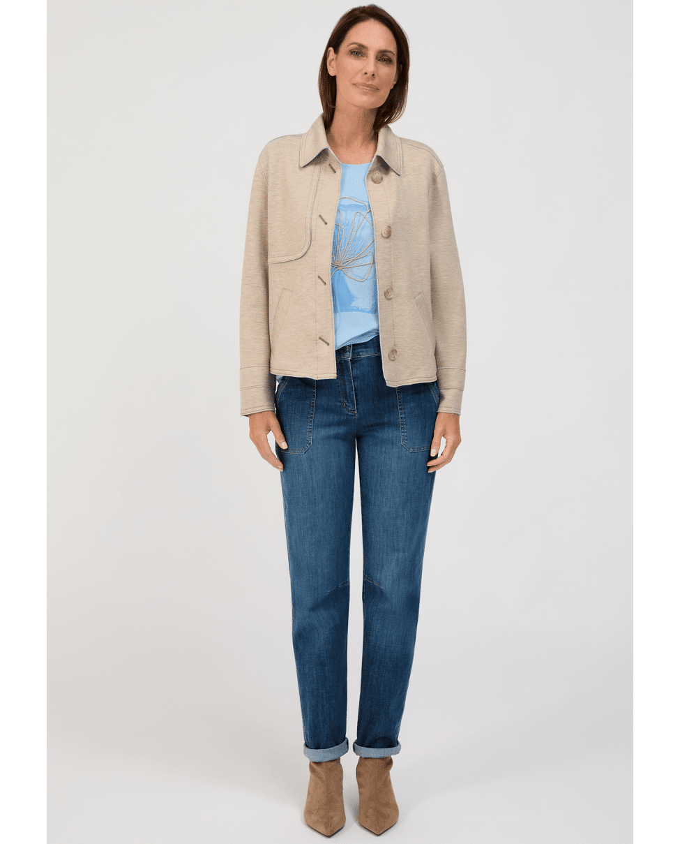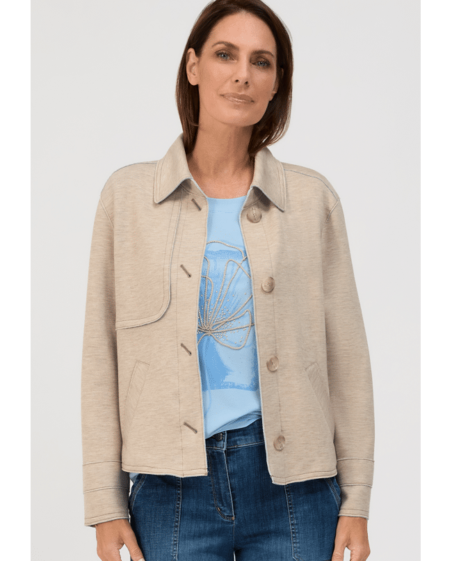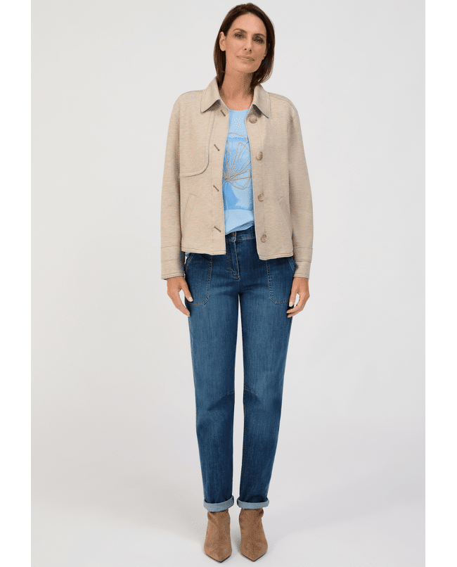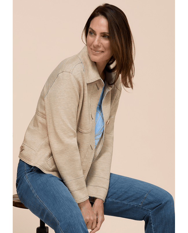 Het KATHERIN jasje van Bianca is een kort model met een zachte feel en sportieve knoopsluiting. Een fijne tussenjas voor frisse lentedagen.