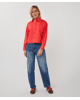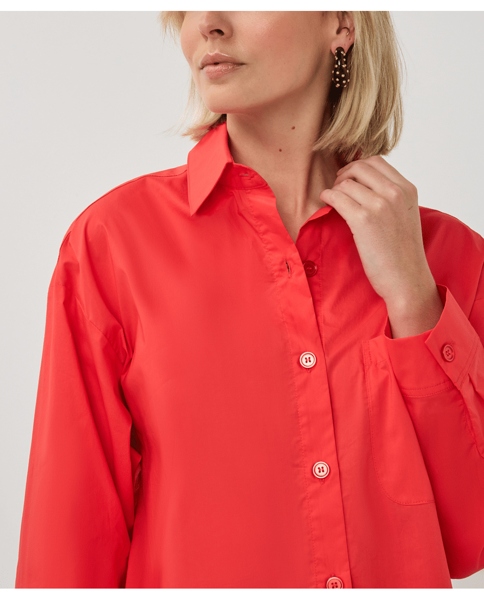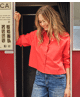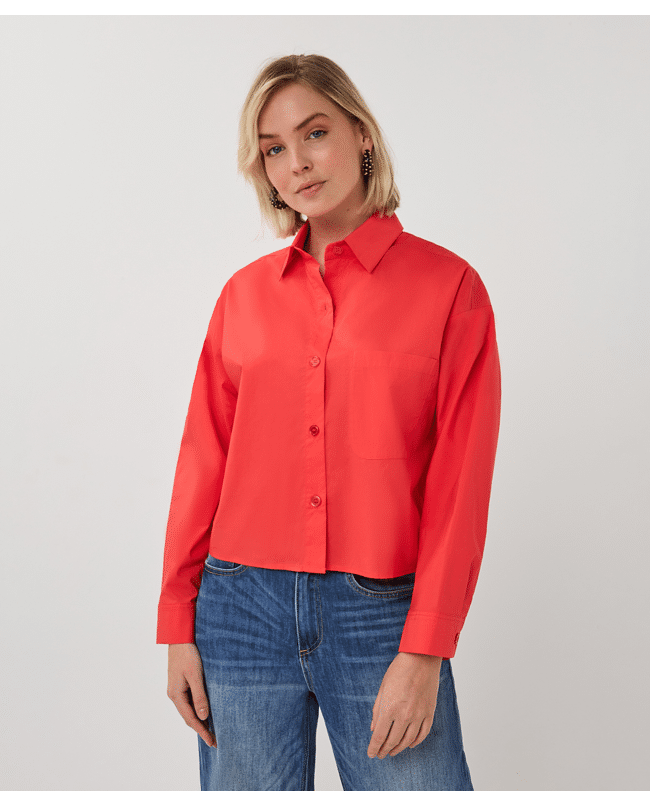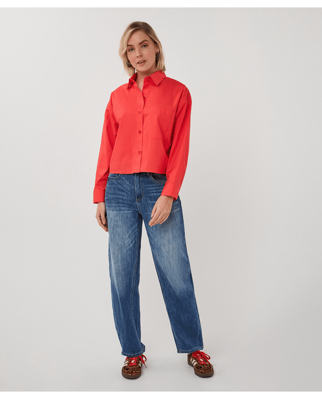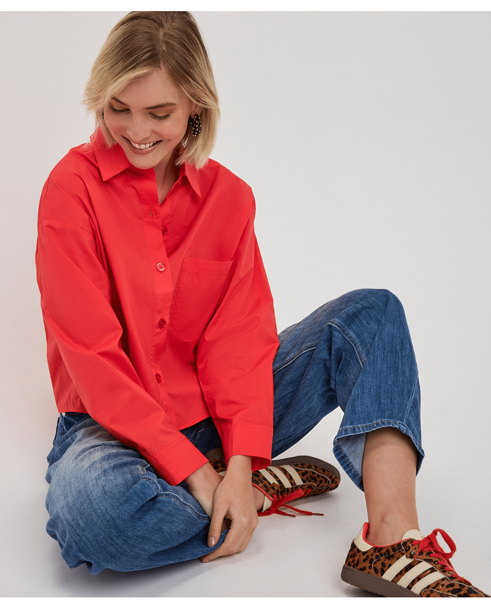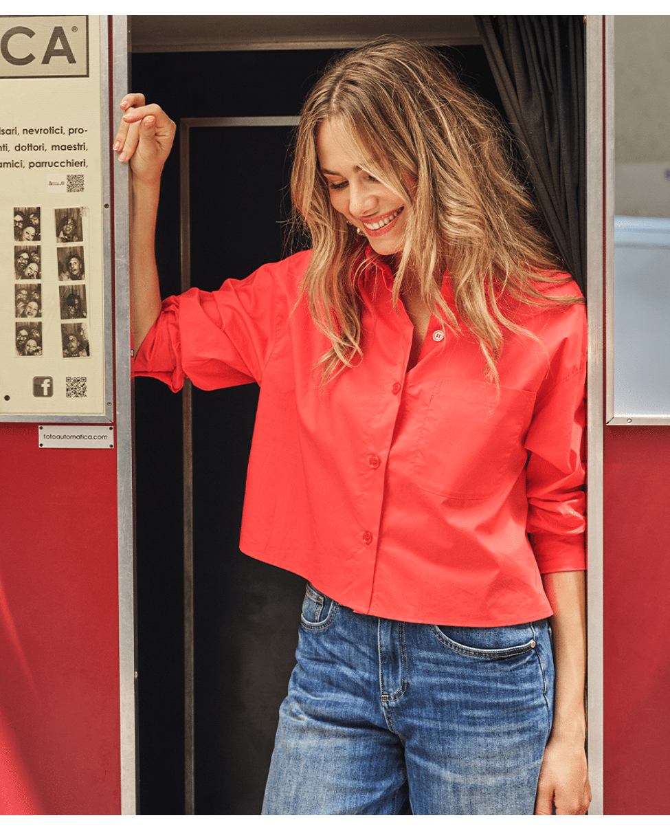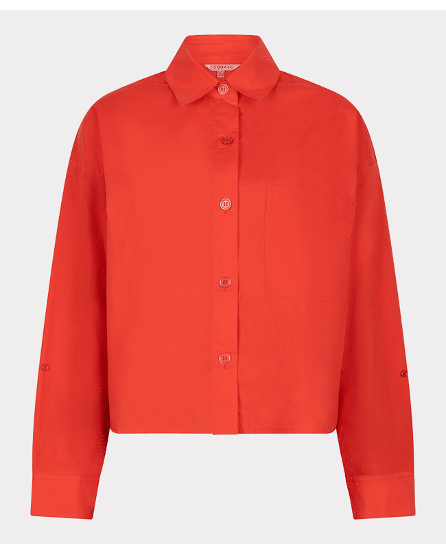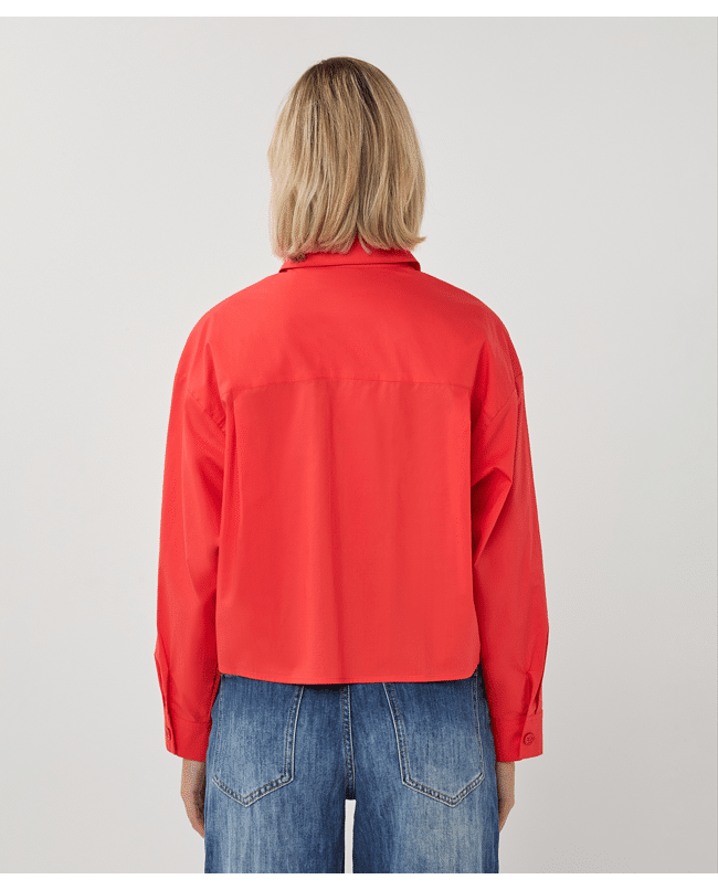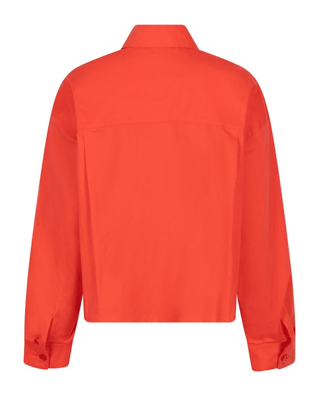 Een cropped blouse in chili red, gemaakt van 100% katoen. De opgerolde mouwen en losse snit geven deze blouse een frisse, eigentijdse uitstraling – perfect voor zonnige dagen.