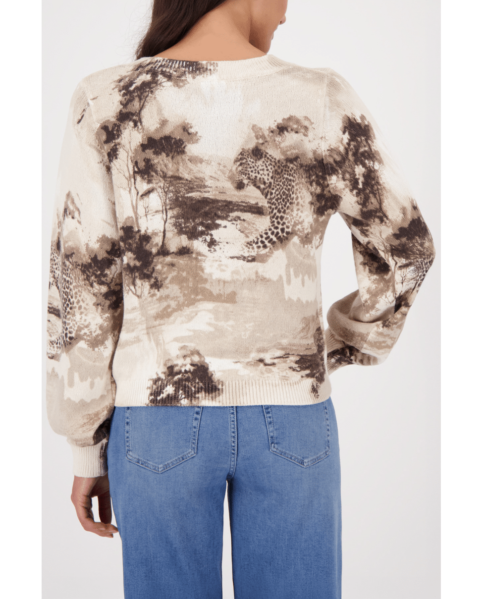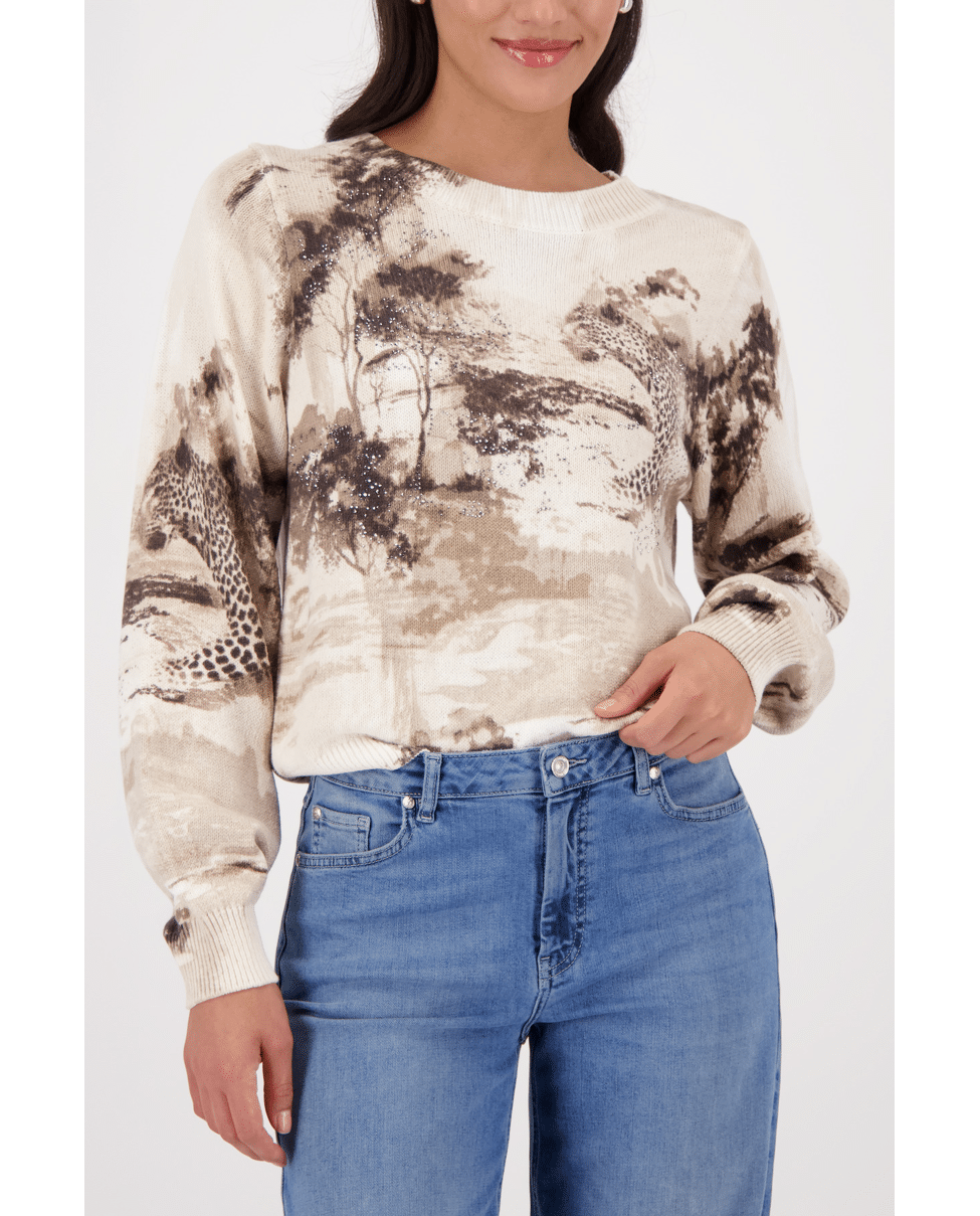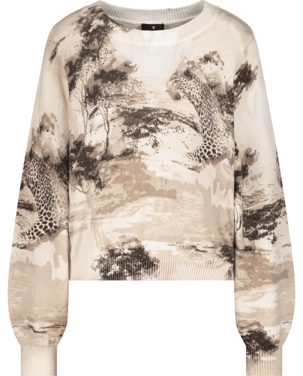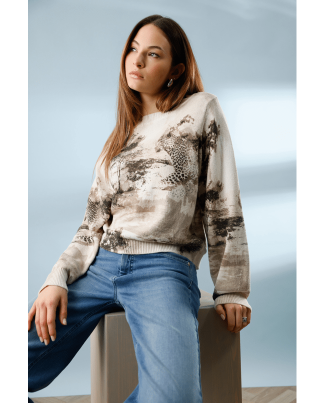 Beige trui met artistieke savanneprint en luipaarden – een zachte eyecatcher voor het voorjaar. Ideaal voor wie comfort wil combineren met uitgesproken stijl.