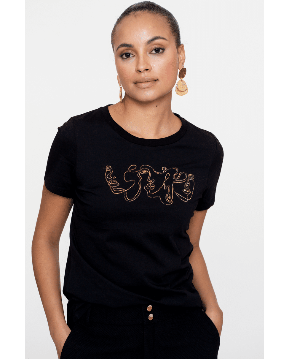 Een T-shirt met gouden gezichtslijntekening op de borst. Het katoenen materiaal voelt zacht aan en is perfect voor elke dag.