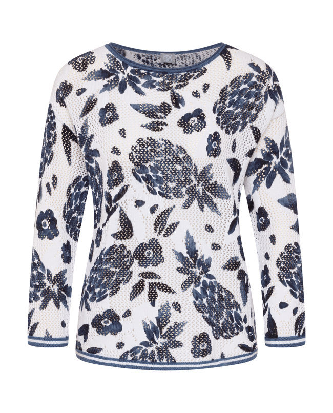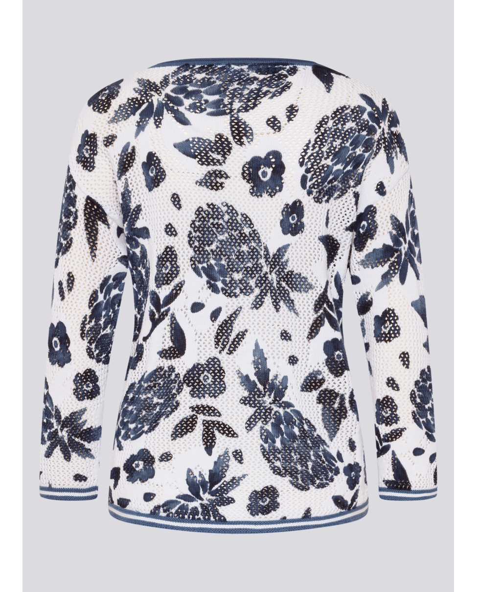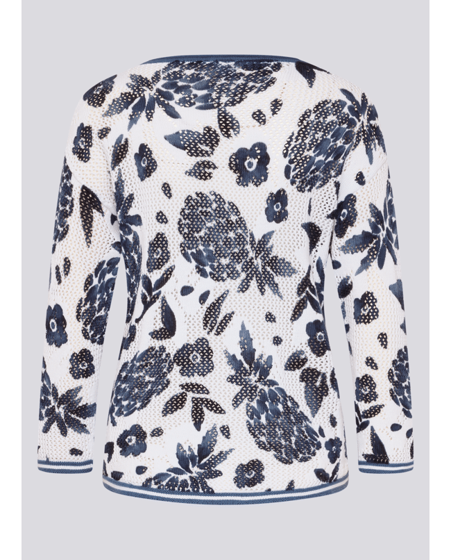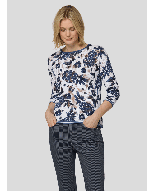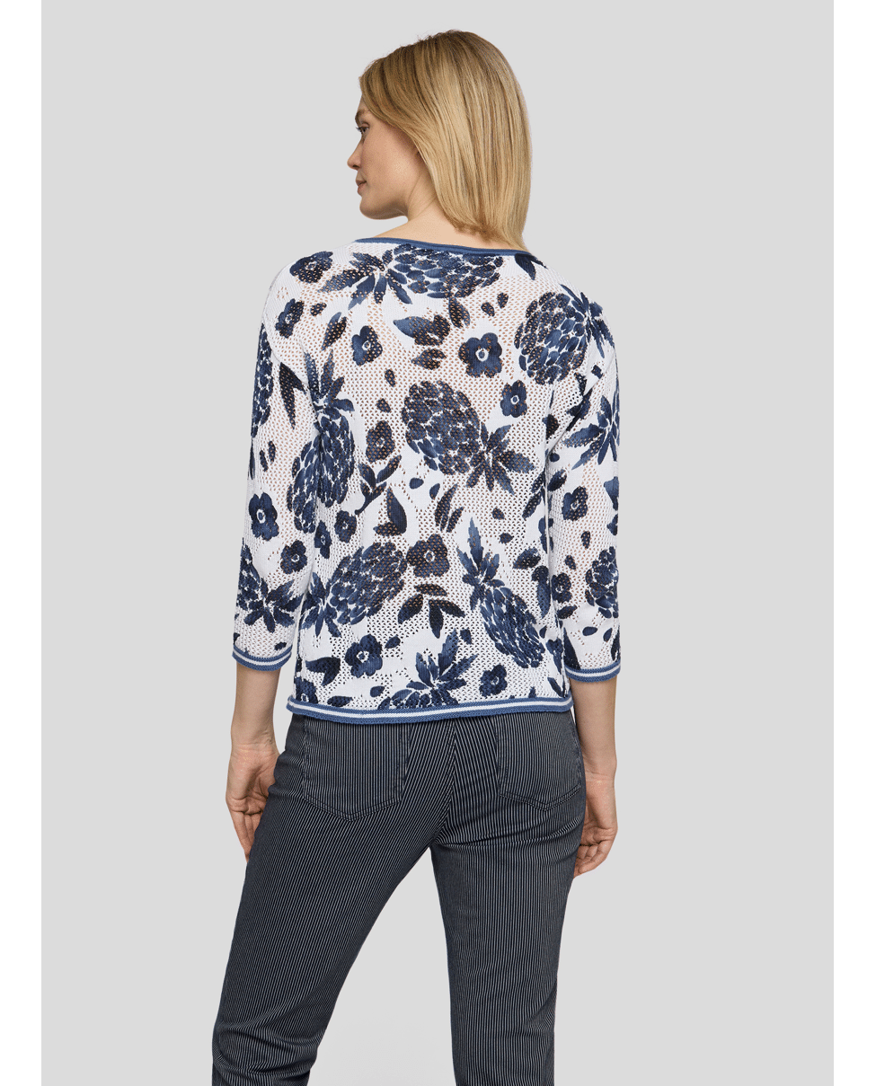 Katoenen dames trui van Rabe met opengewerkte structuur, ananas- en bloemenprint, ronde hals en 3/4 mouwen