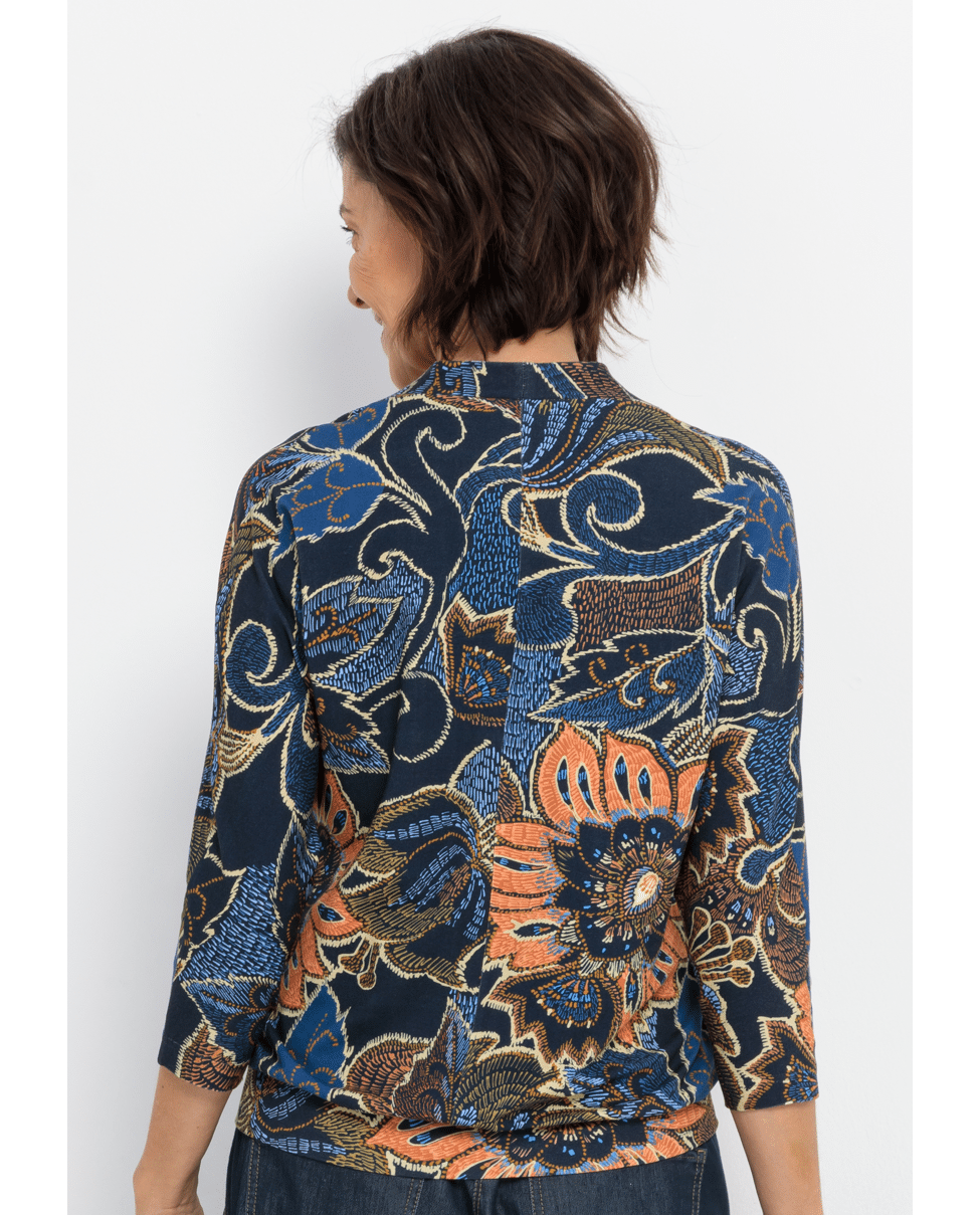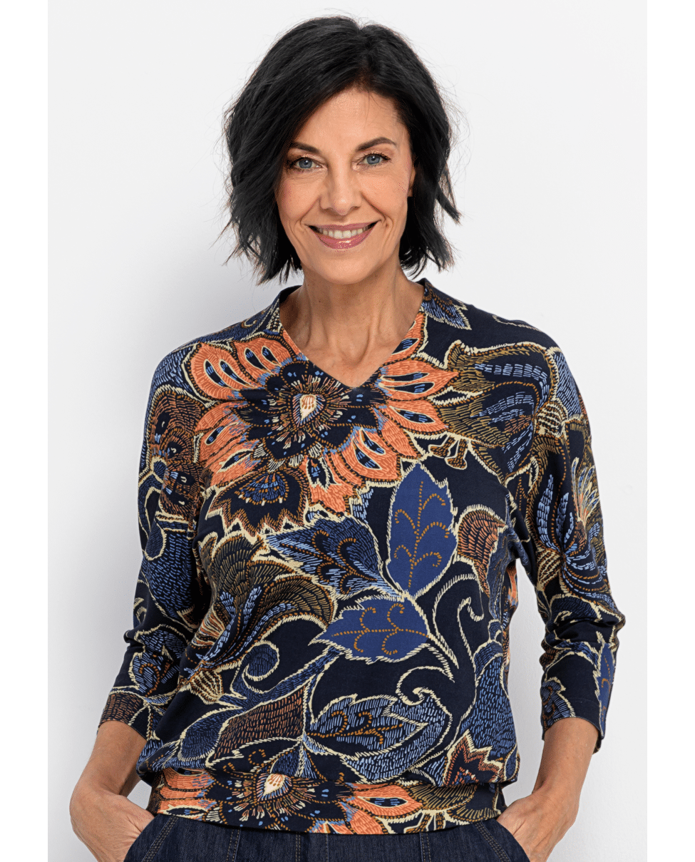 Dit shirt met diepe V-hals en paisleyprint is een opvallend item met comfort. Perfect om kleur toe te voegen aan je herfst- en wintergarderobe.