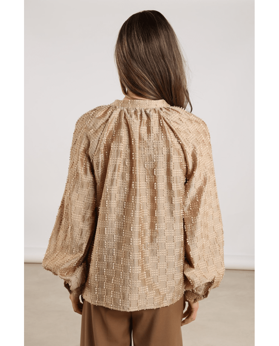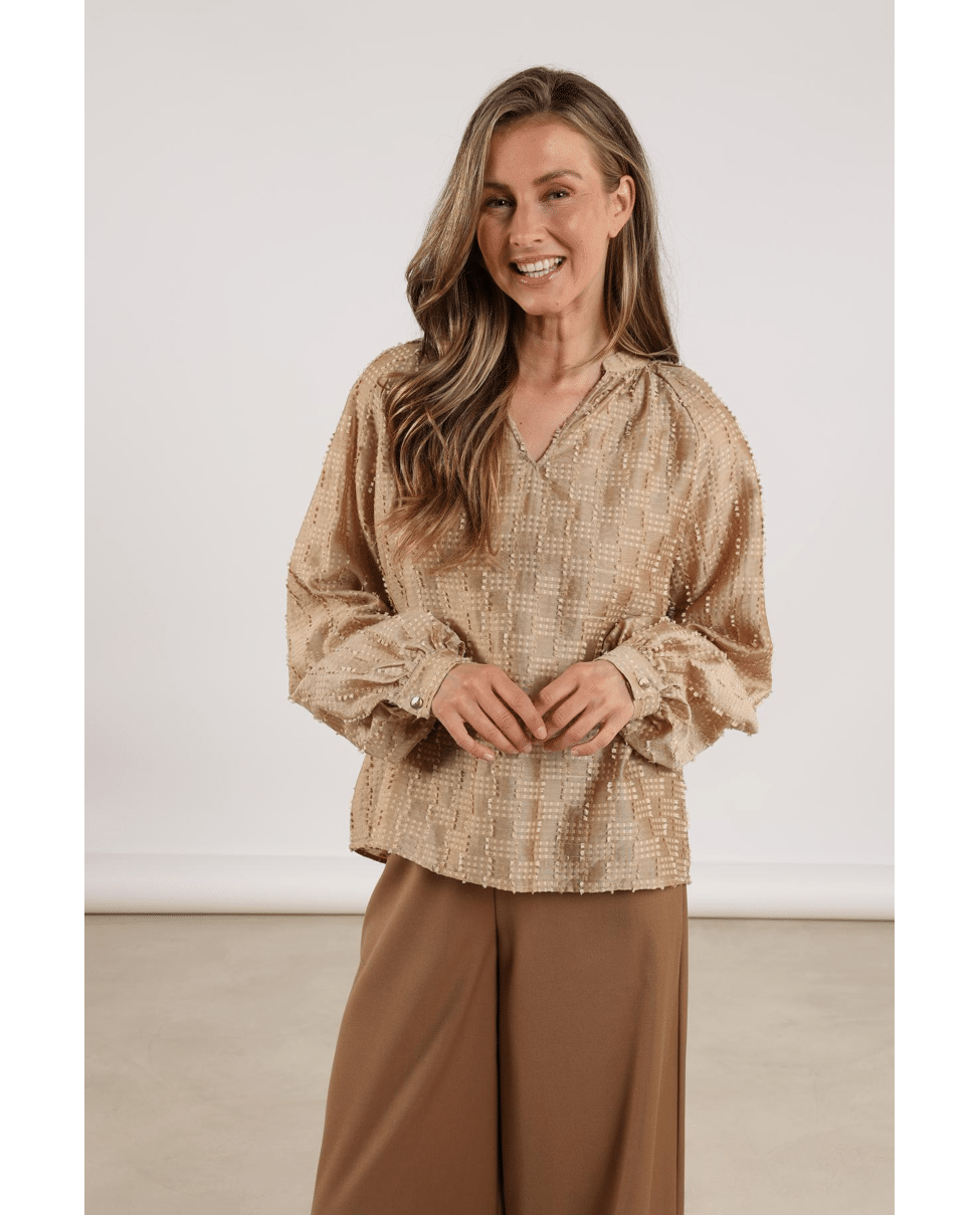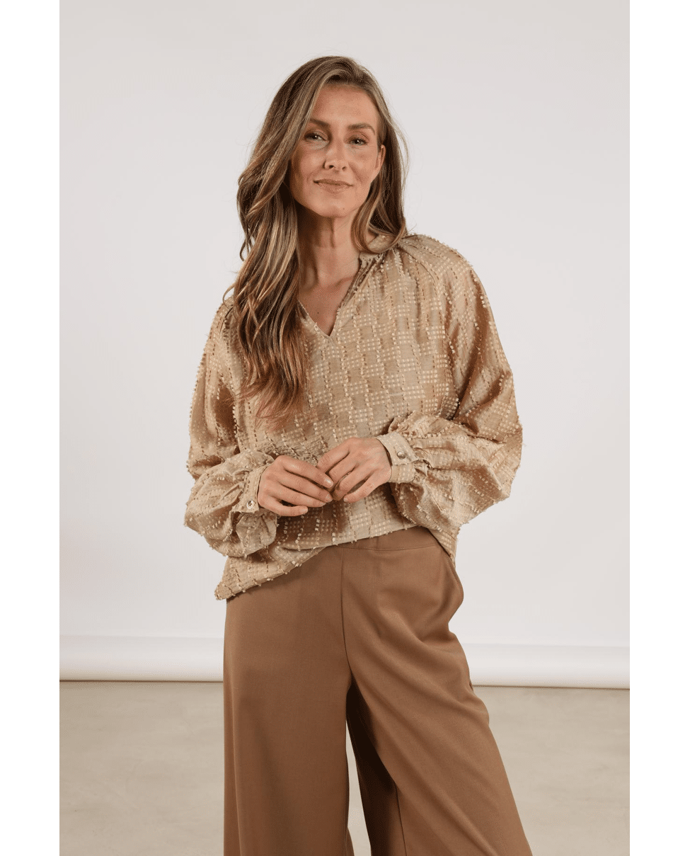 Deze camel kleurige blouse met rijke textuur en raglanmouwen voelt vrouwelijk én comfortabel. Ideaal voor dagen waarop je er moeiteloos verzorgd uit wilt zien.