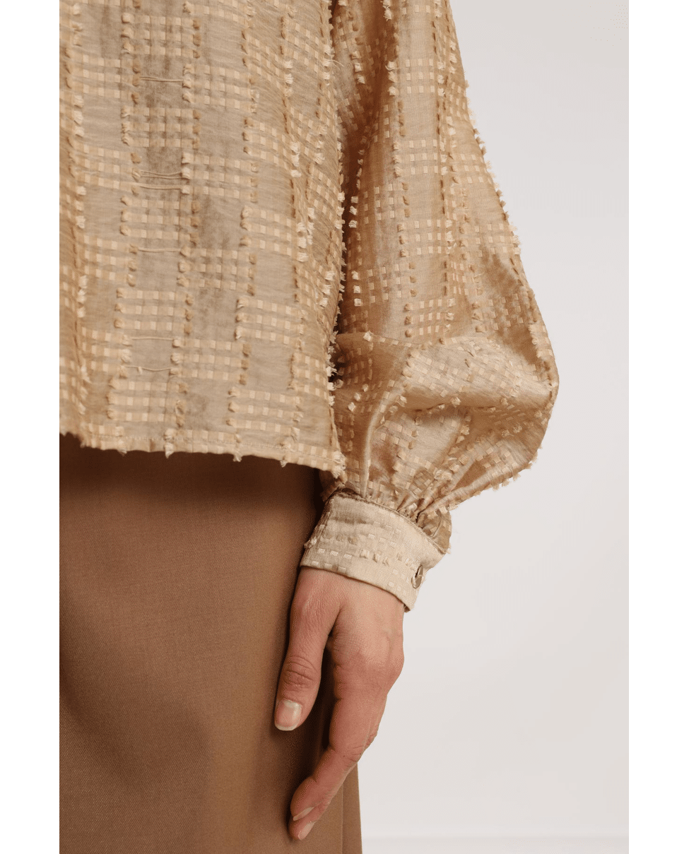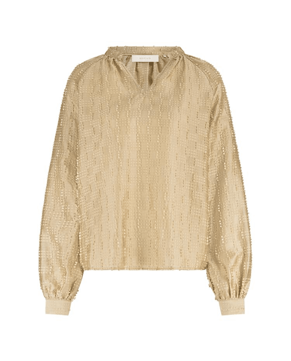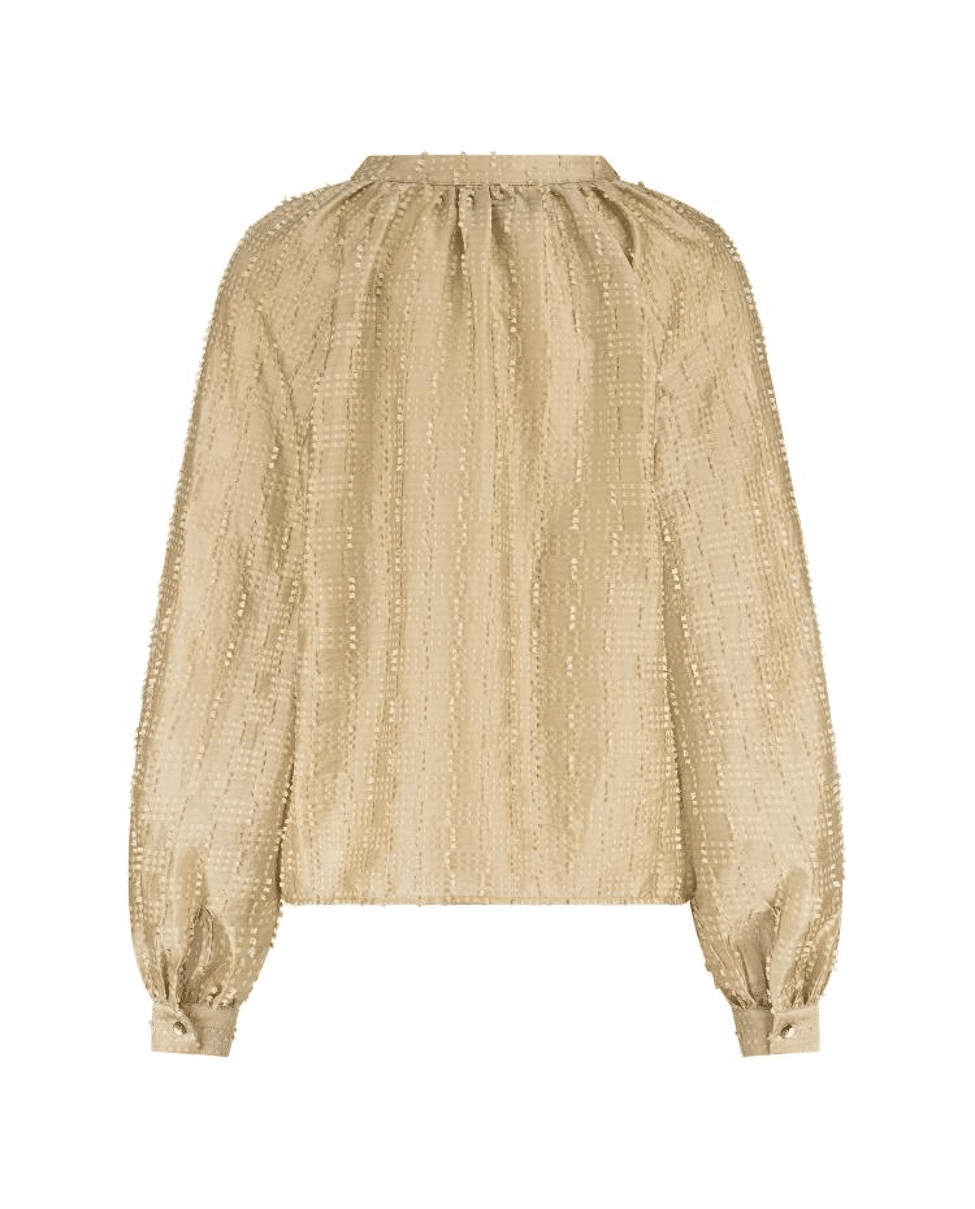 Deze camel kleurige blouse met rijke textuur en raglanmouwen voelt vrouwelijk én comfortabel. Ideaal voor dagen waarop je er moeiteloos verzorgd uit wilt zien.