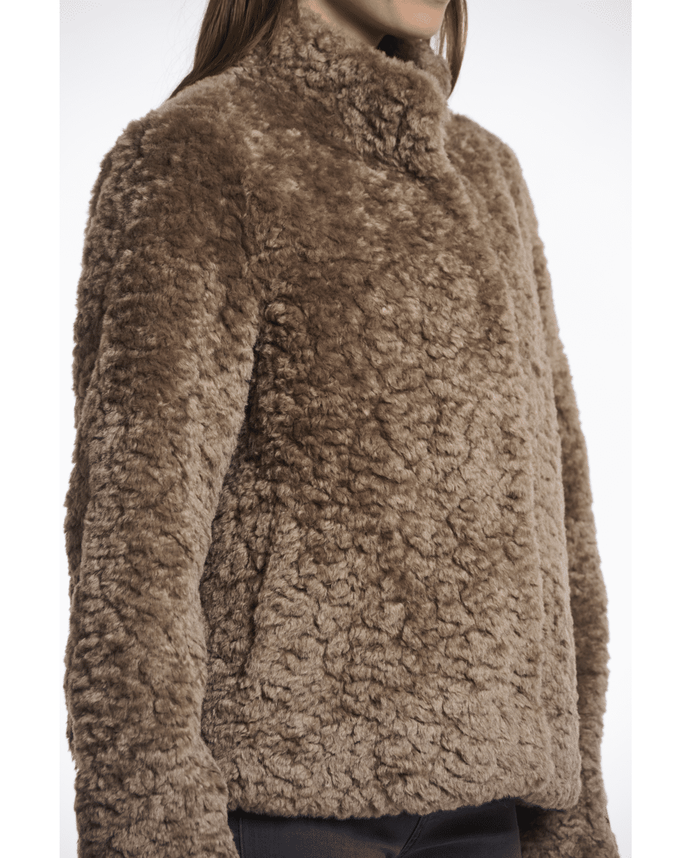 De fluffy textuur en hoge hals maken deze jas een stijlvolle keuze op gure dagen – van stad tot bos.