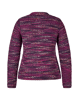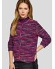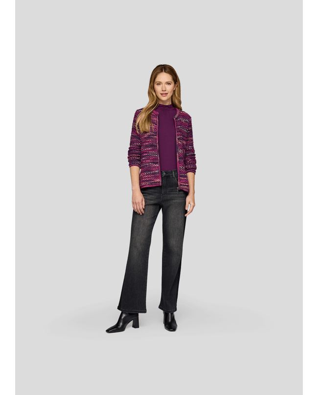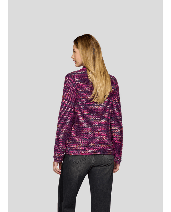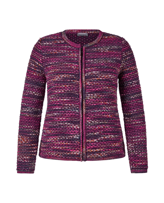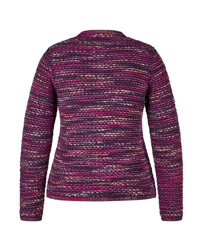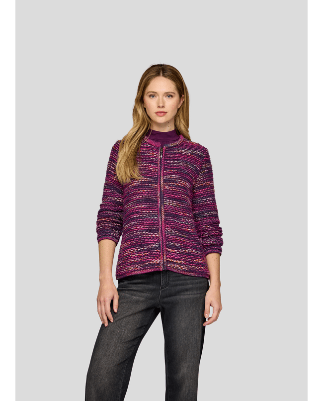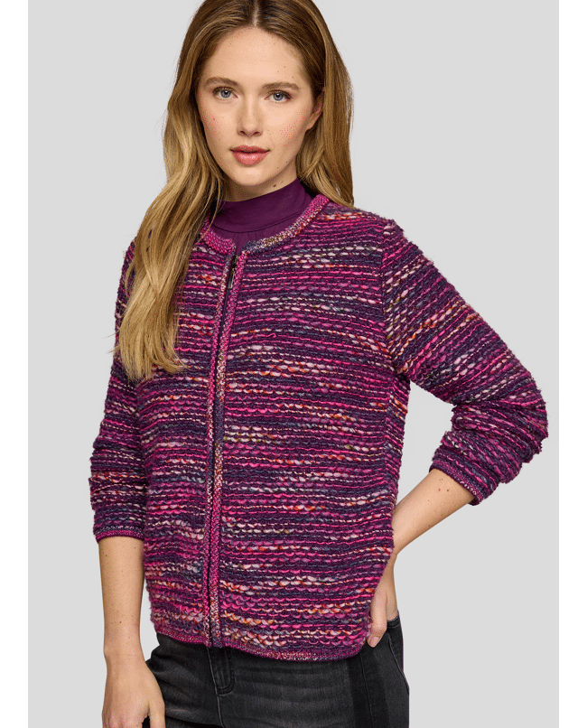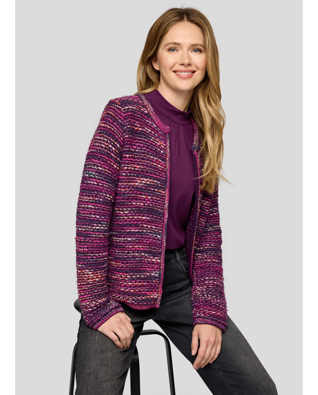 De structuursteek en mix van paarse, roze en oranje tinten geven dit jasje een handgemaakte feel – net even anders, net even leuker.