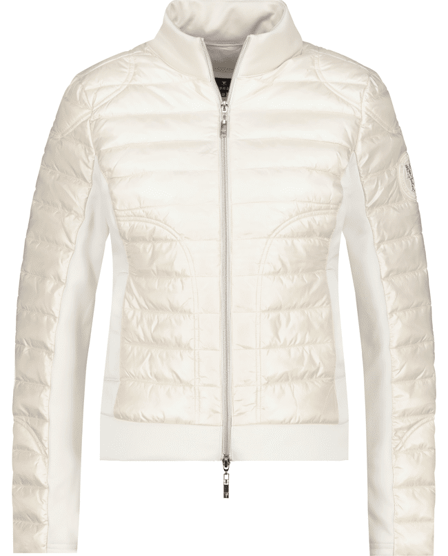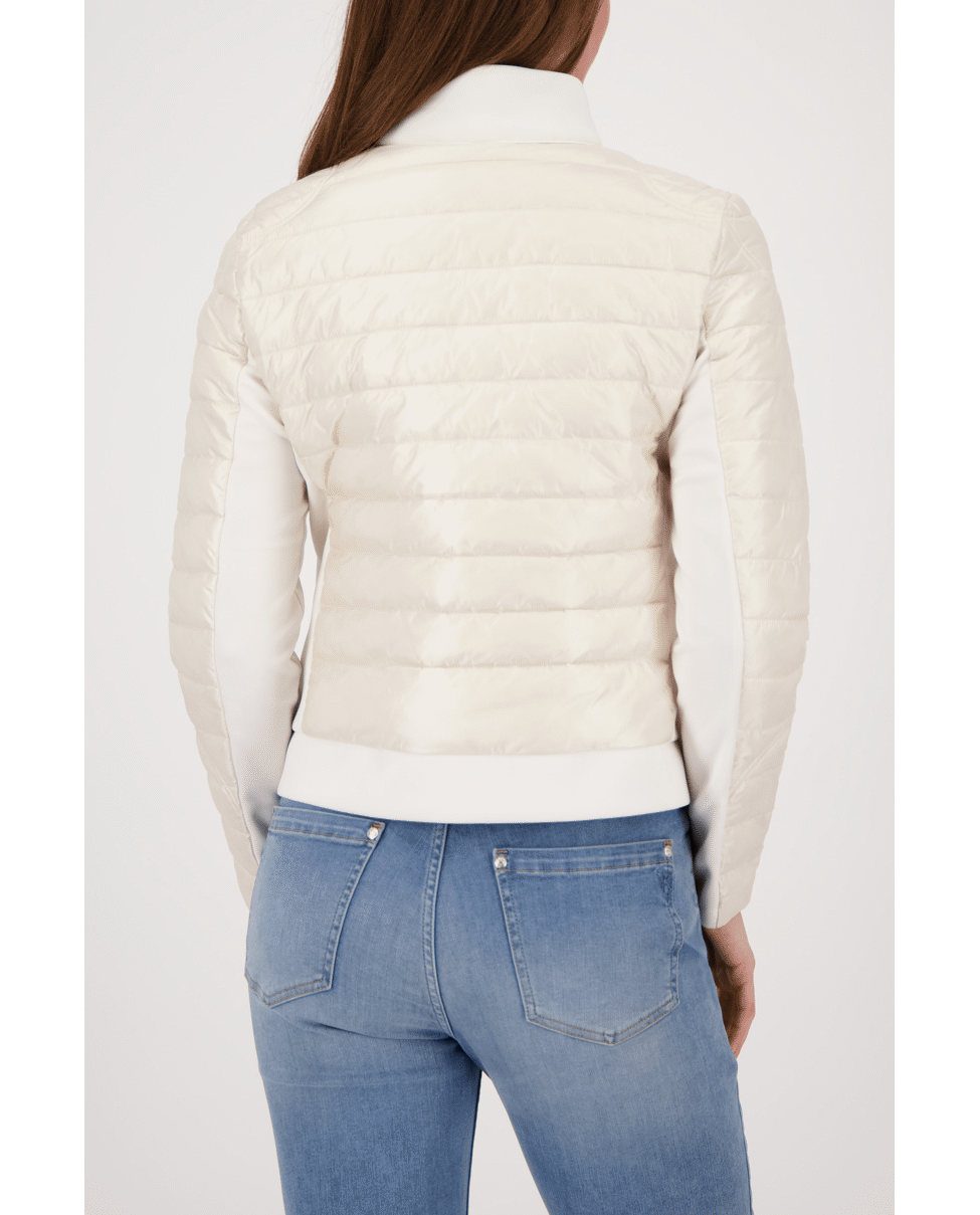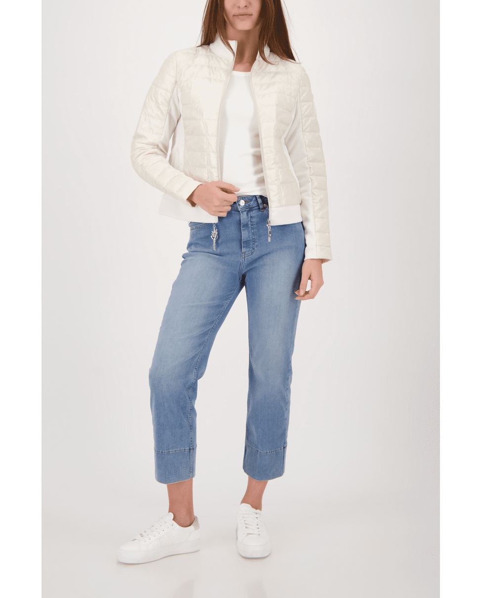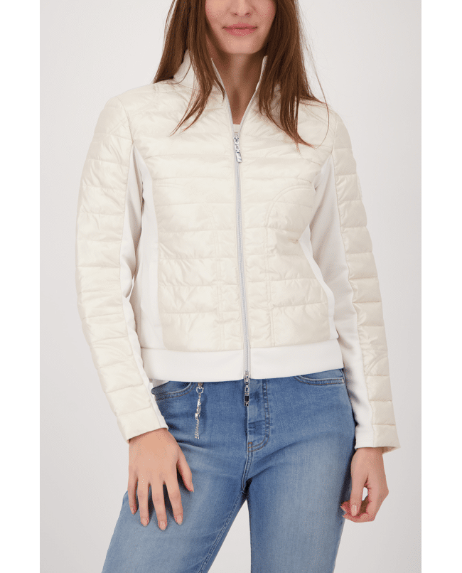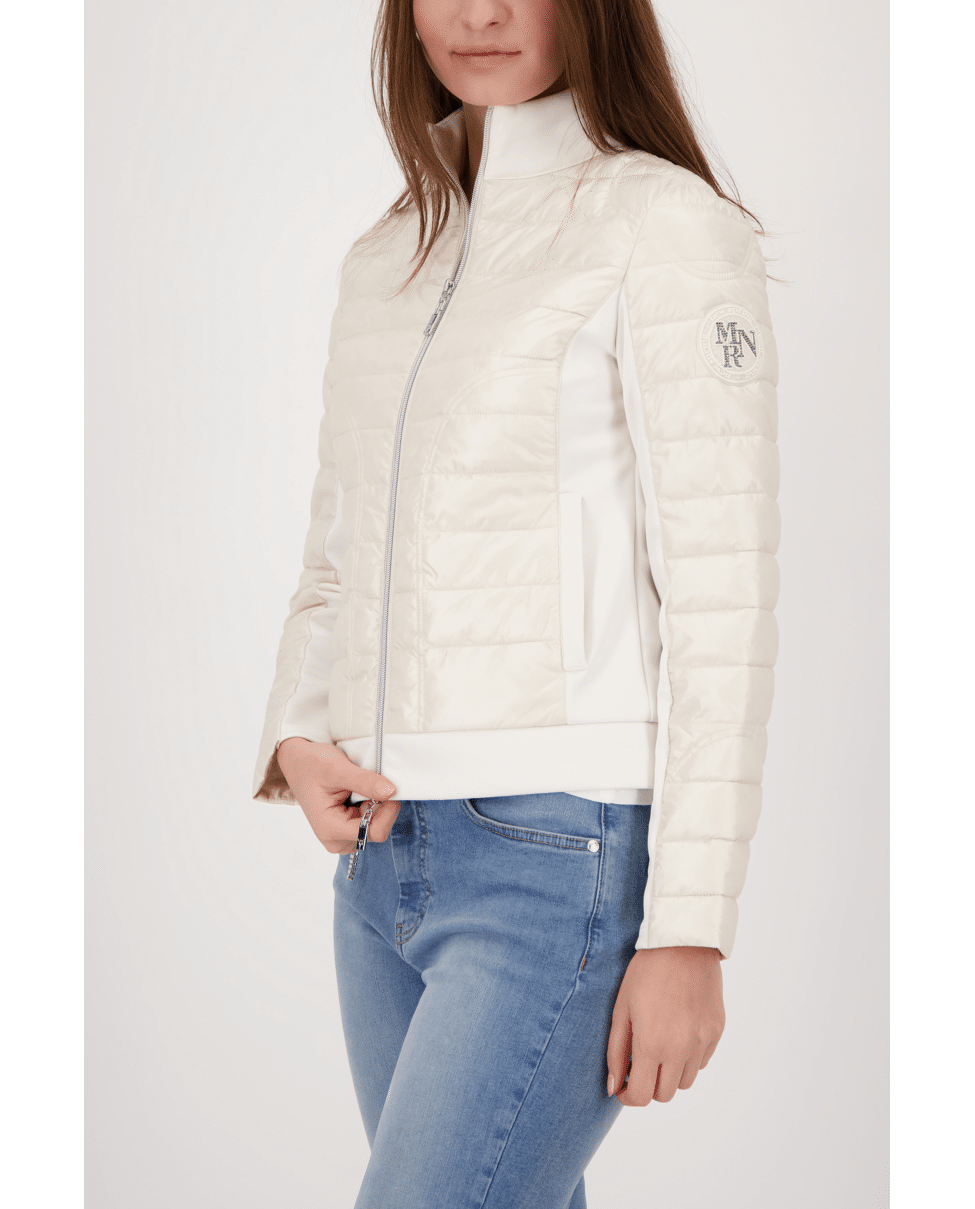 Deze Monari jas combineert gewatteerde stof met glad neopreen. Ideaal als tussenseizoensjack voor frisse lente- of zomeravonden.