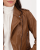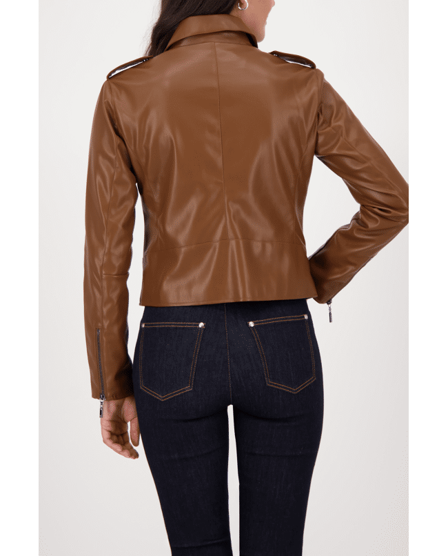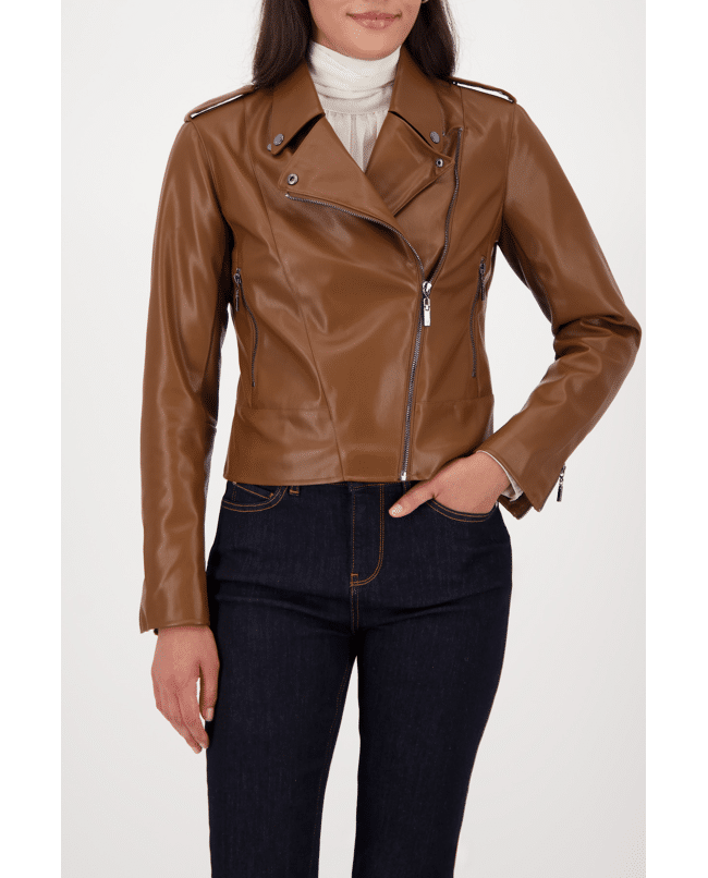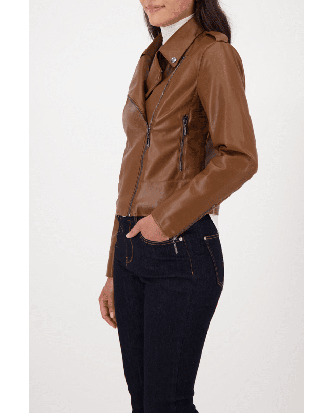 De matte leerlook en kleur geven dit jack een krachtige uitstraling. Combineer met een trui en boots voor een casual citylook.