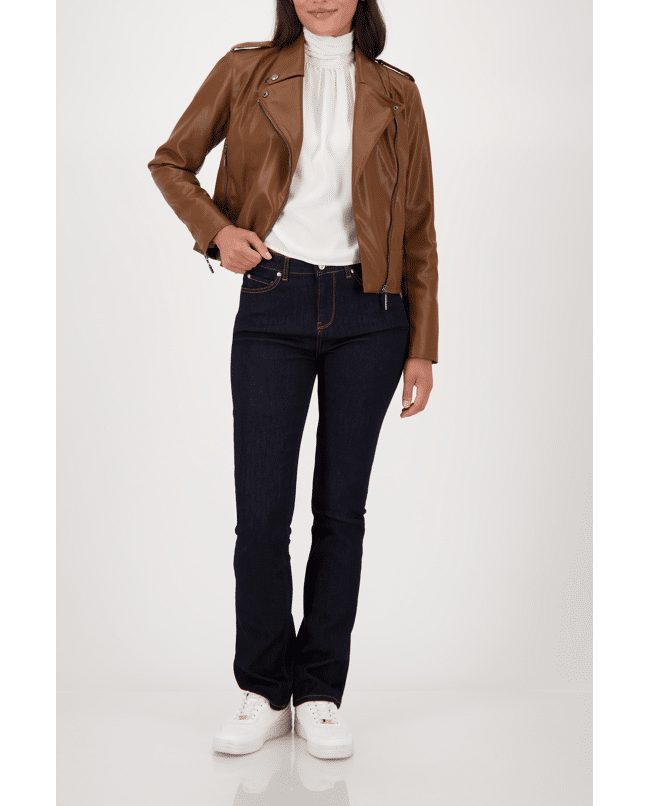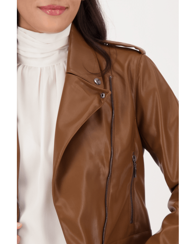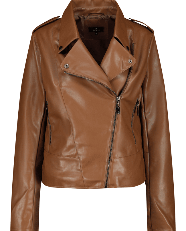 Dit bikerjack in leerlook brengt karakter en comfort samen. Een eigentijds jasje voor het seizoen – stoer én stijlvol voor elke dag.