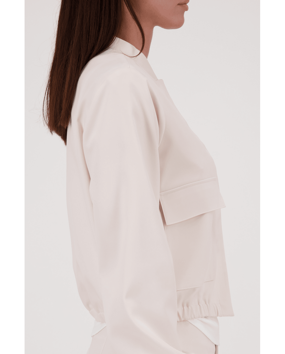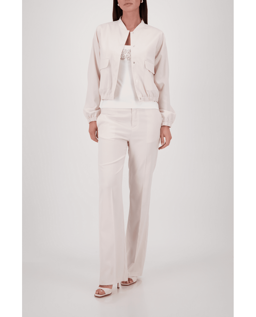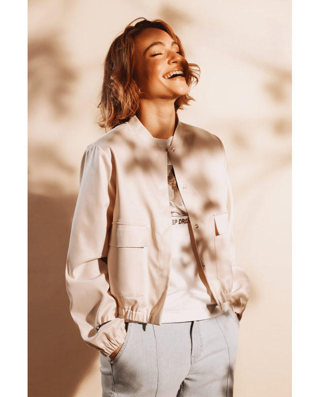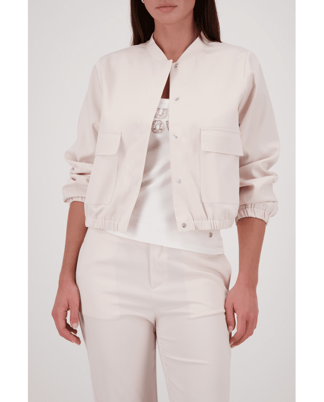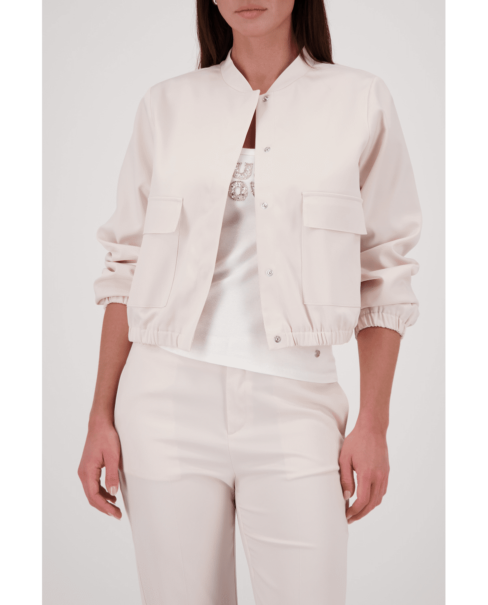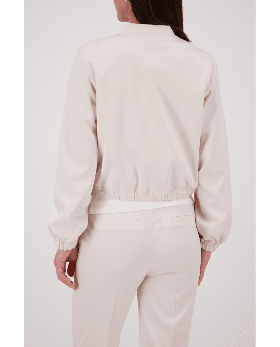Dit korte damesjasje van Monari is een stijlvolle mix van sportief en verfijnd. De zachte beige tint en satijnachtige finish geven dit model een moderne uitstraling voor het voorjaar en frisse zomerdagen.