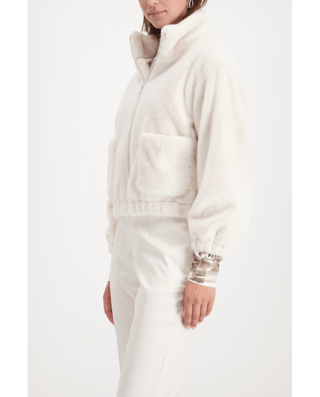 De combinatie van het korte model en de aaibare stof maakt deze jas zowel modern als comfortabel.