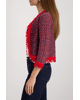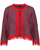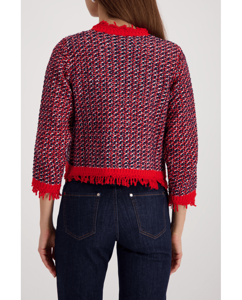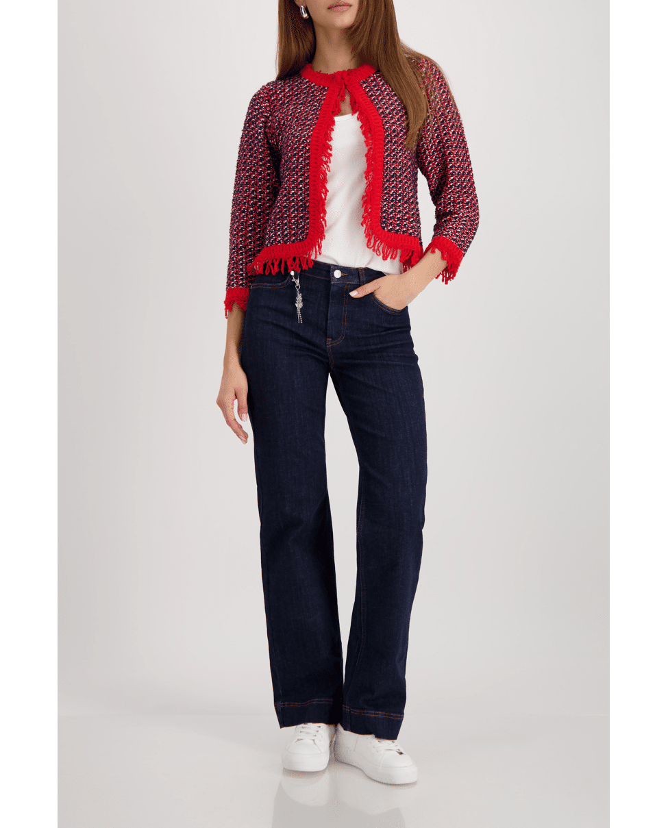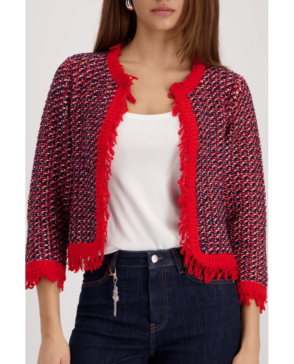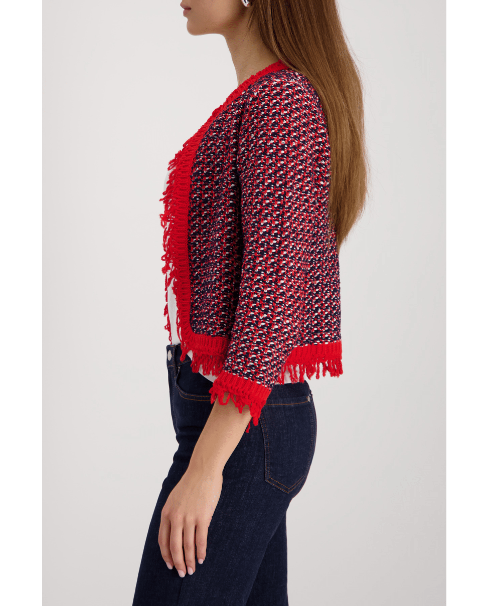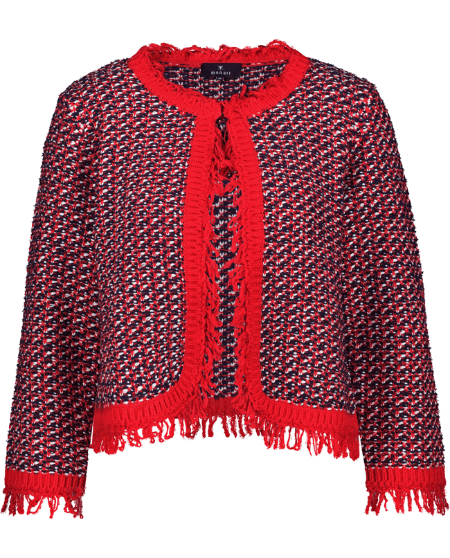Kort tweed dames jasje van Monari met franjes, open model met driekwartmouwen
