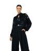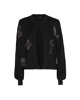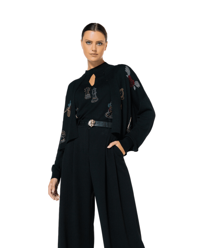 Dit korte vest is versierd met kleurrijke fantasie studs en heeft een verrassend detail aan de hals. Een speelse laag voor frisse dagen.
