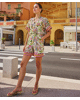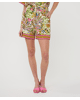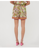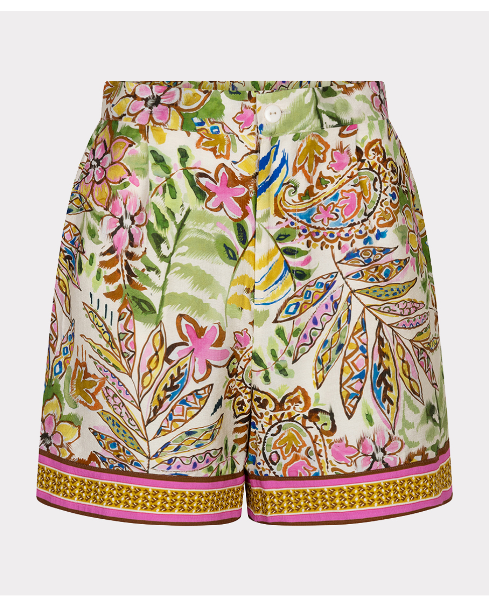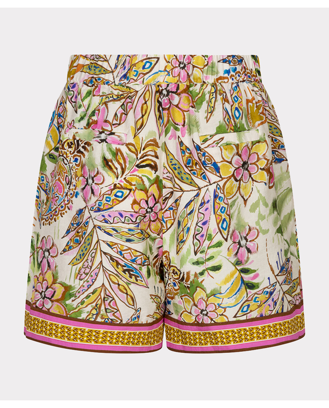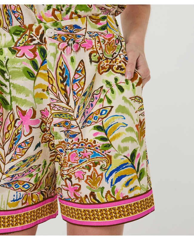 De mix van felle kleuren, sierlijke patronen en de contrasterende bies langs de zoom geeft deze short een energieke zomerlook.
