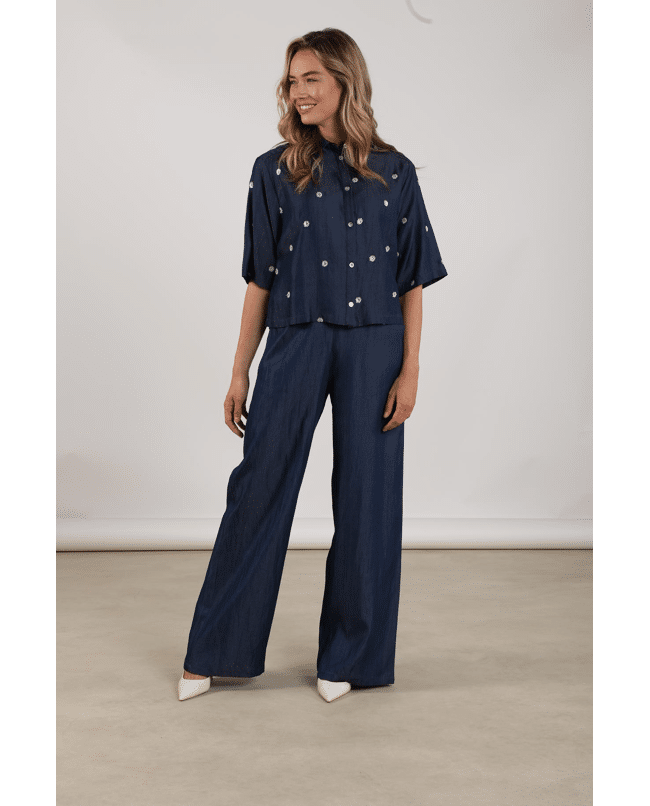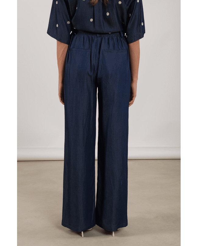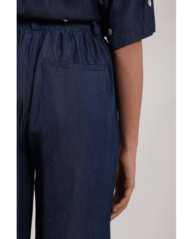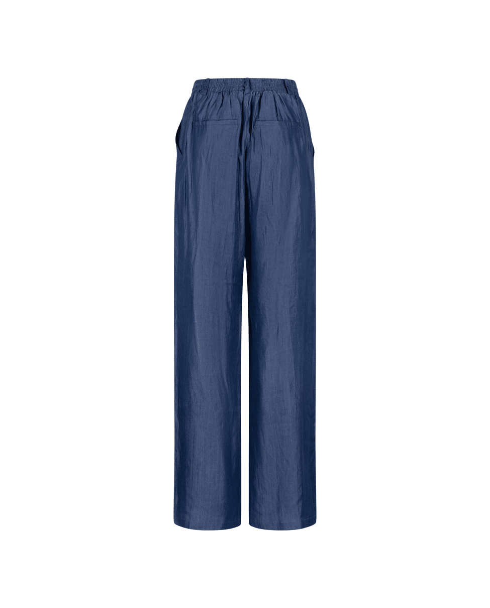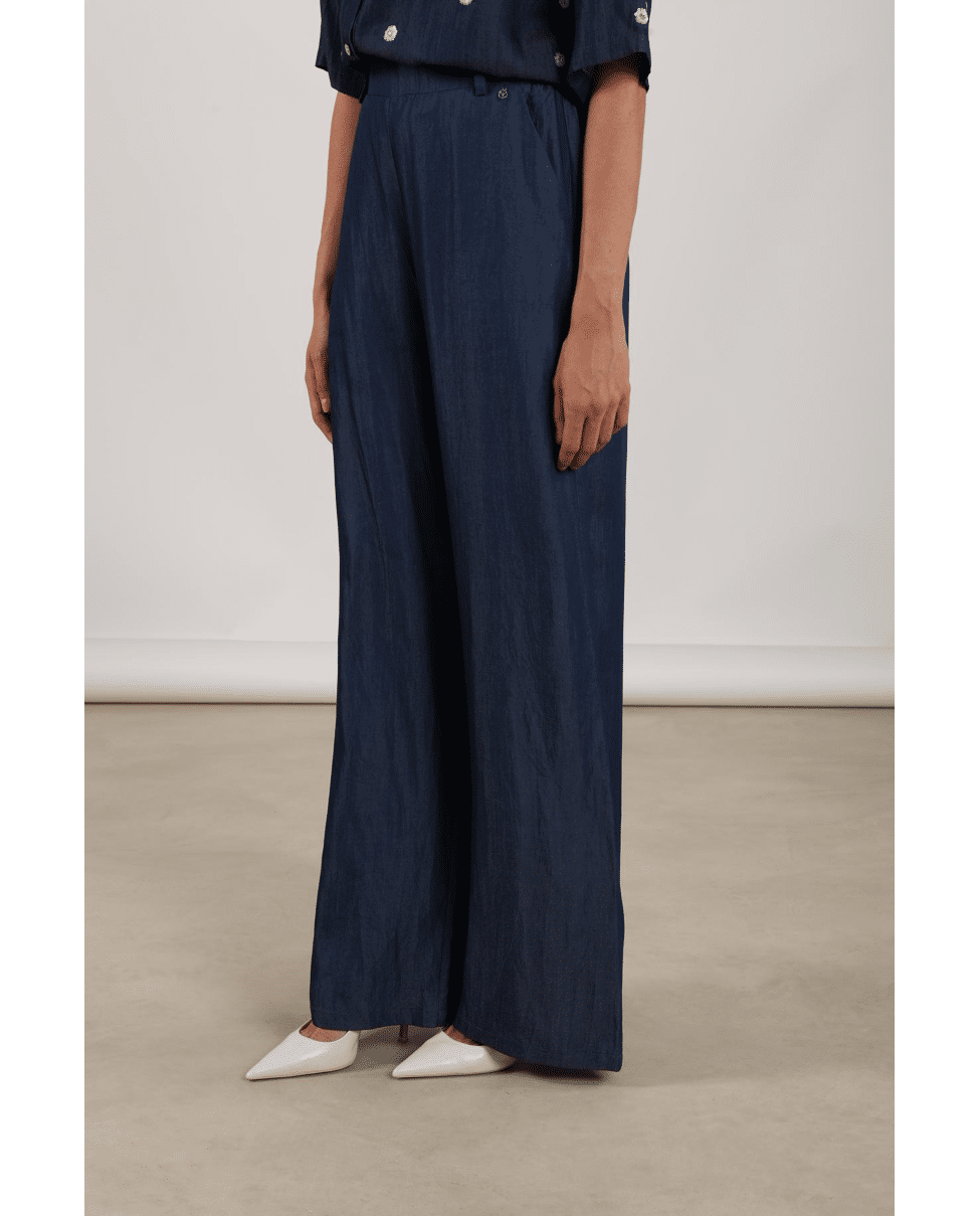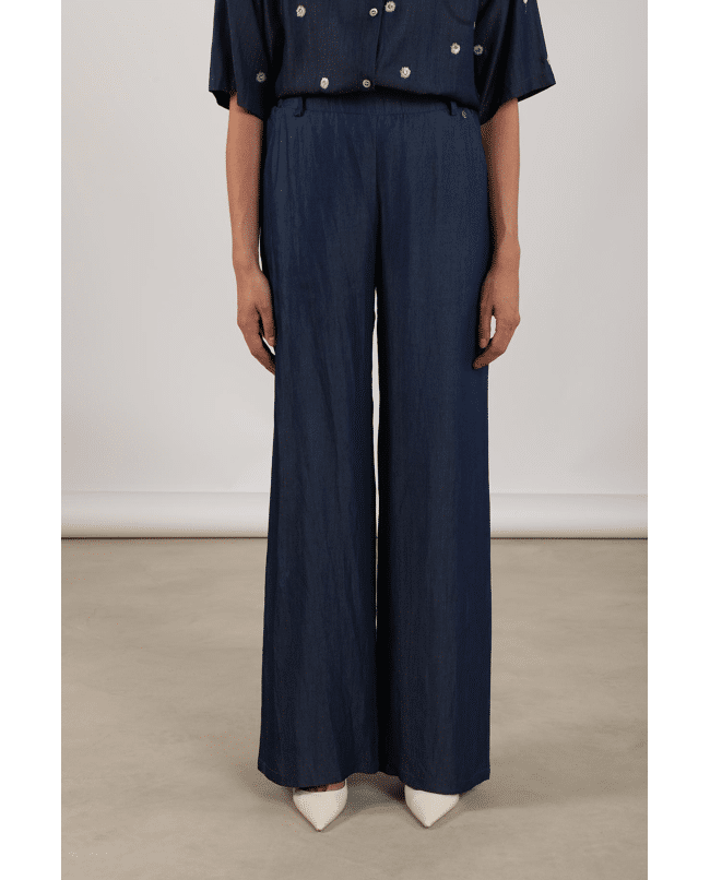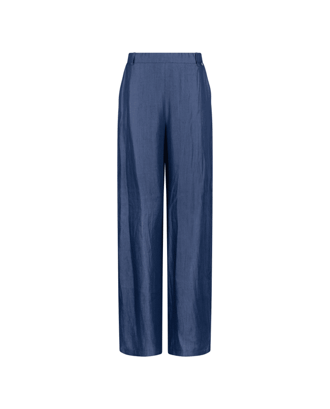 Deze navy broek met subtiele glans geeft je zomerlook een moderne twist. Gemaakt voor comfort én uitstraling – van werkdag tot weekend.