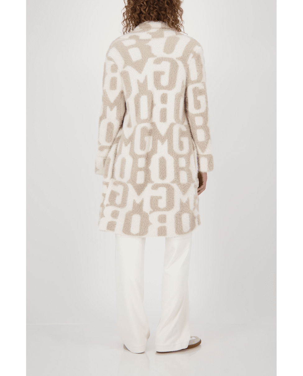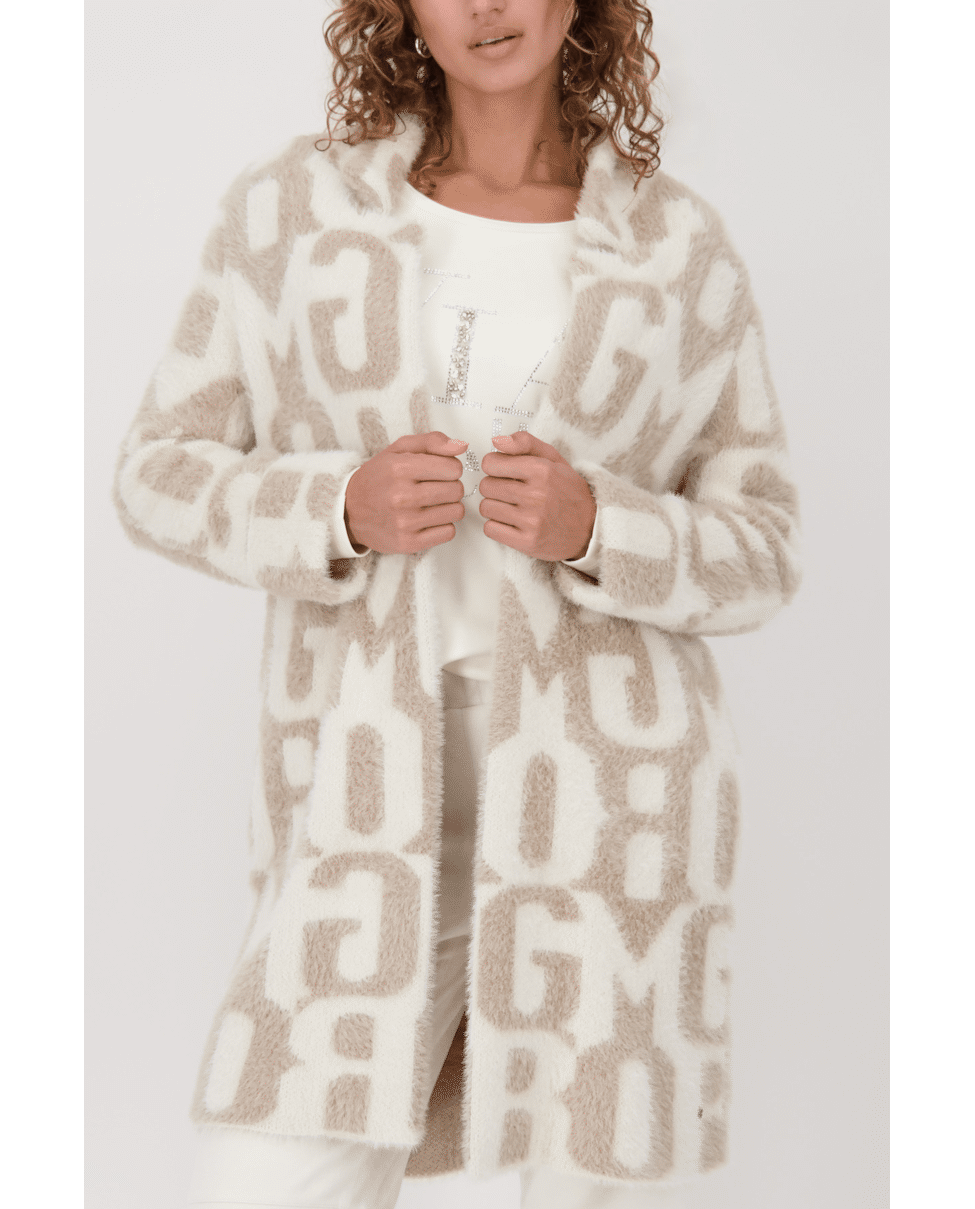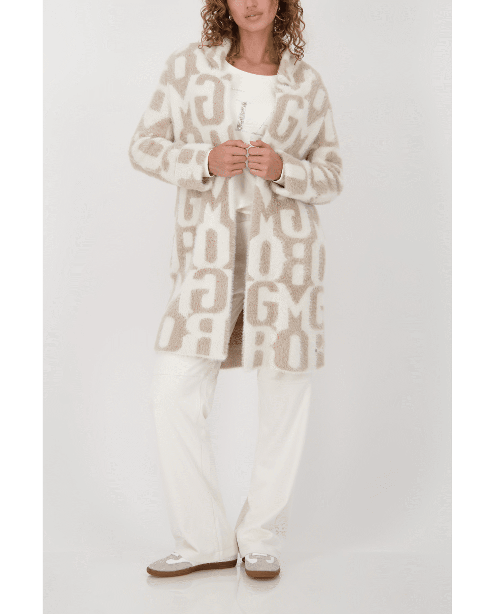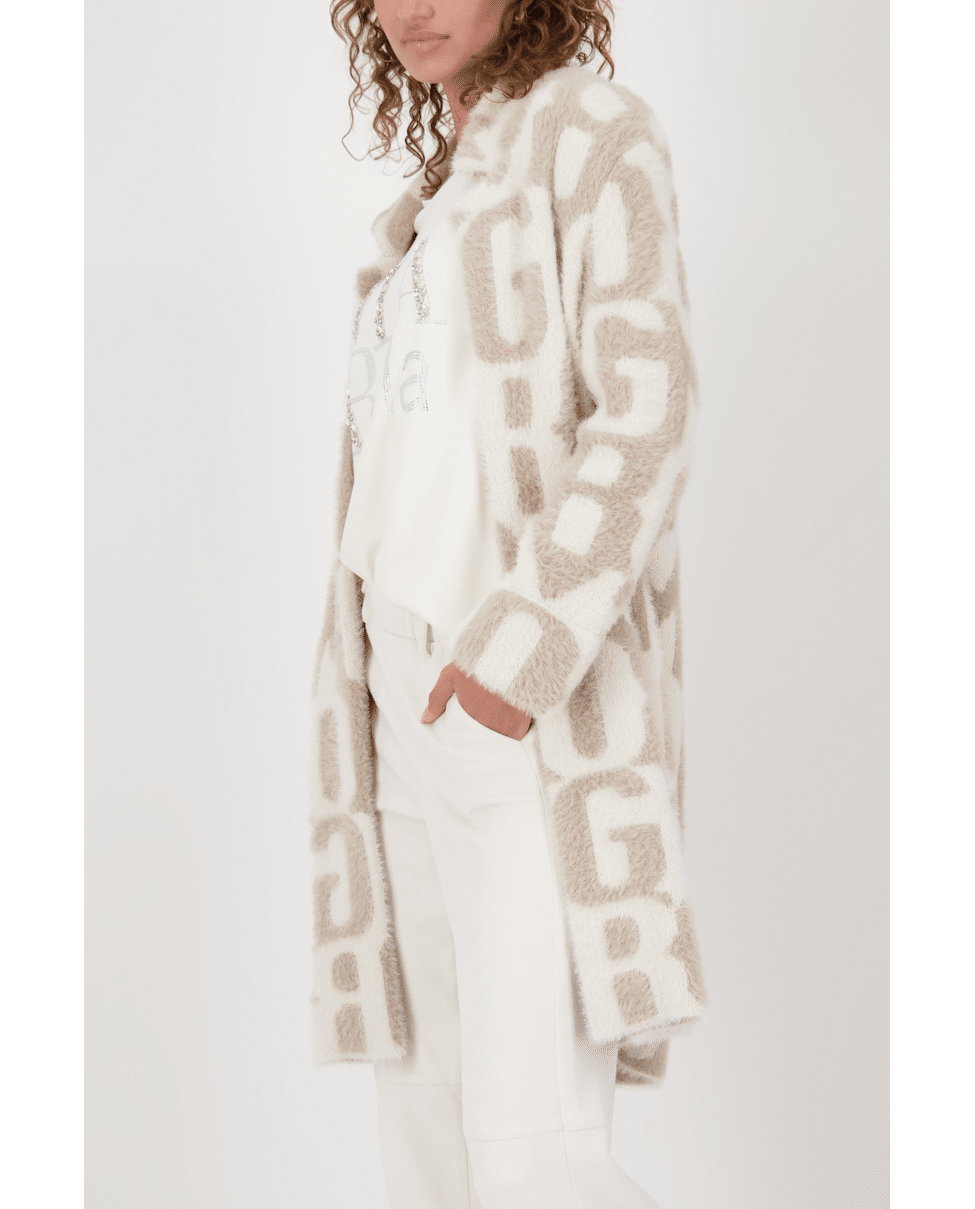 Een echte statement piece: dit lange vest met grafische letterprint is zacht, opvallend en perfect voor gelaagde herfstlooks.