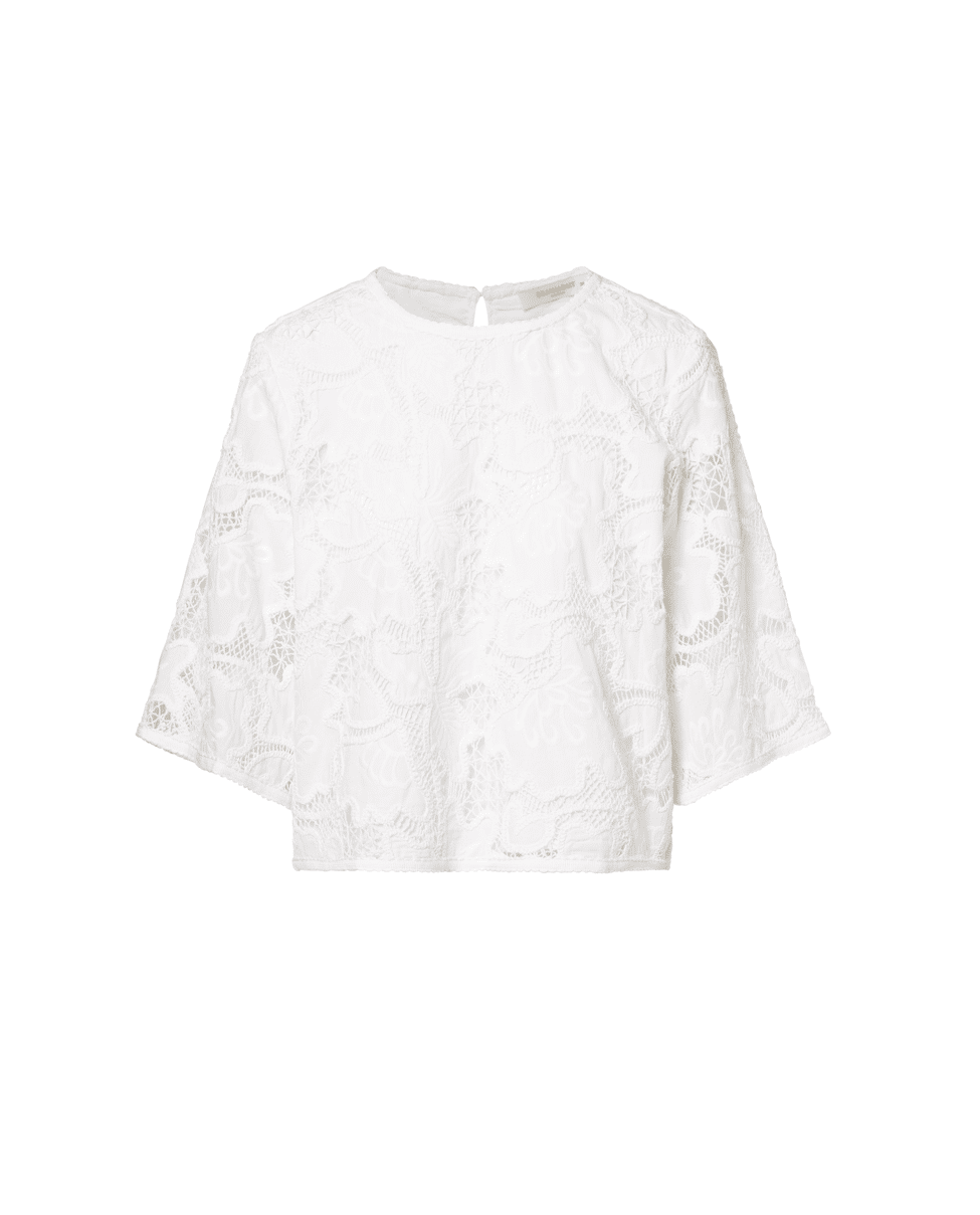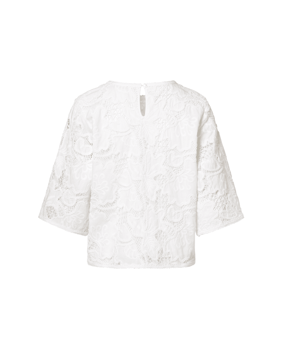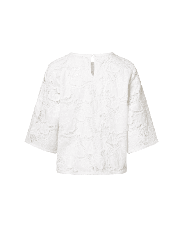 Luchtige witte katoenen top met all-over kant, perfect voor zomerse dagen. Combineer met een linnen broek of denim voor een frisse, vrouwelijke look. Ideaal voor casual momenten of een etentje op het terras.