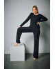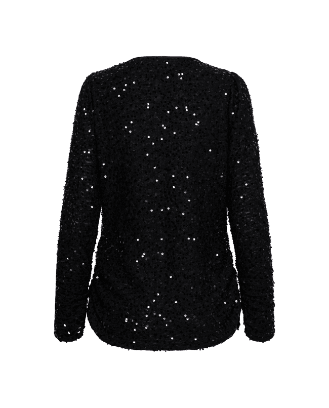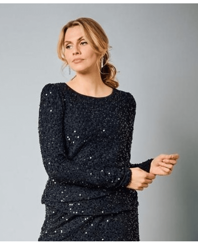 Deze feestelijke top met ronde hals en lange mouw voegt meteen glamour toe aan je look. Perfect voor feestjes, etentjes of een avond uit.