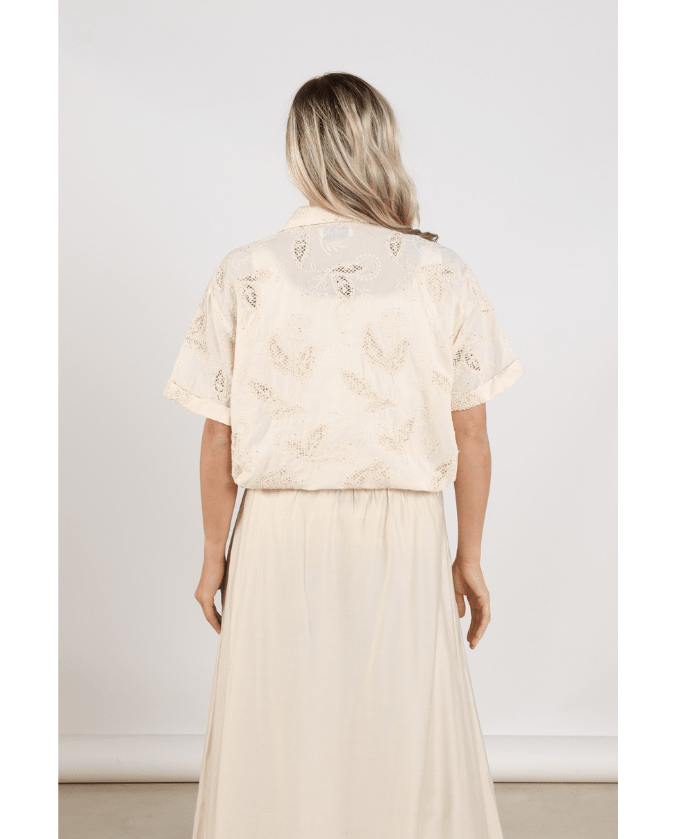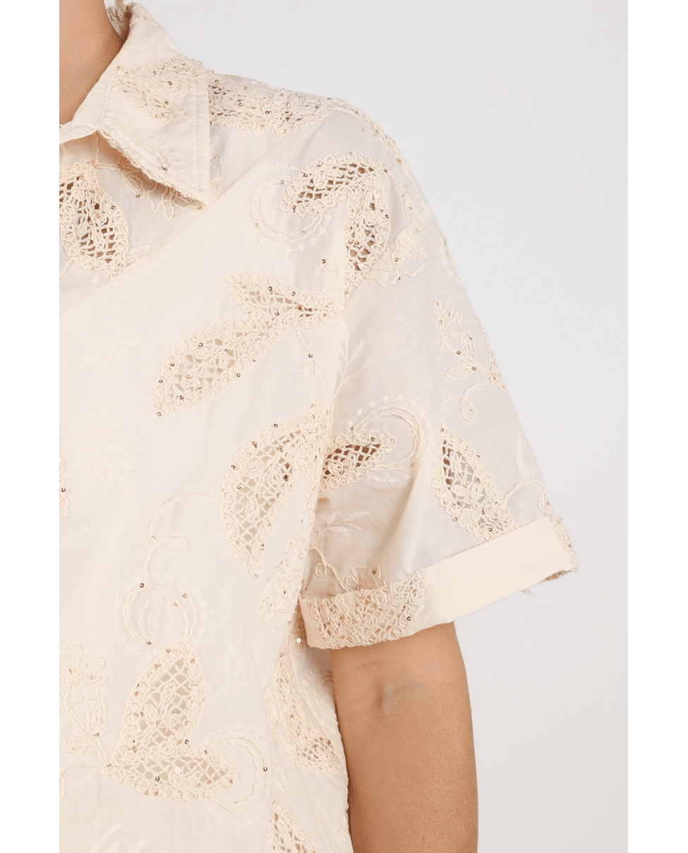 Deze luchtige Leonora blouse van Nukus is een verfijnde toevoeging aan je zomergarderobe. De zachte sand kleur en het subtiele borduursel geven een elegante, rustige uitstraling die makkelijk combineert.