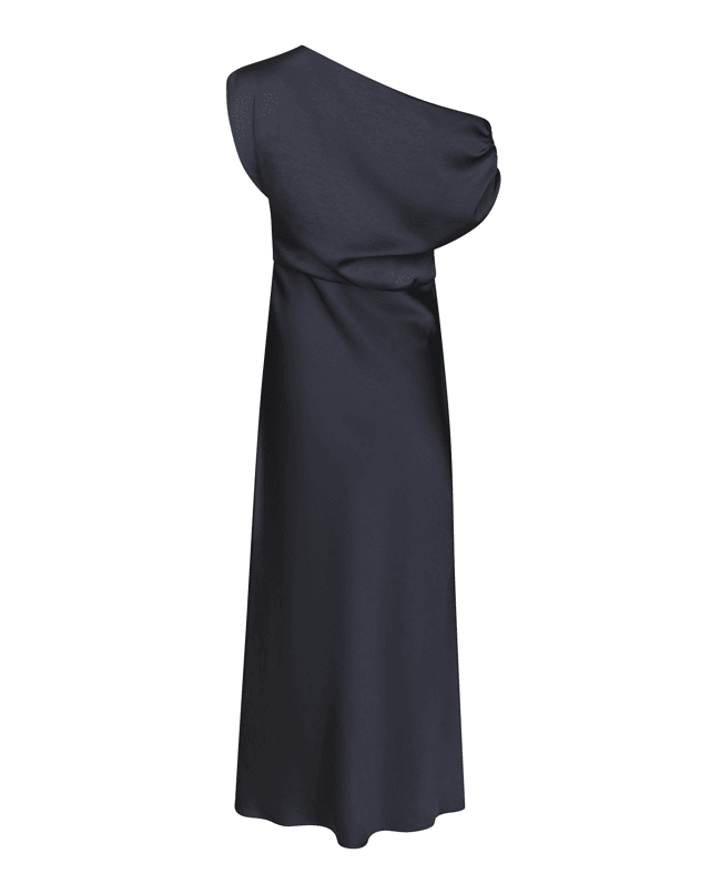 Deze heavy sateen jurk is een elegante blikvanger met een verfijnde, vrouwelijke uitstraling. De watervalhals en het knoopdetail aan de voorzijde geven de jurk een zachte, vloeiende belijning. Perfect voor een bruiloft, gala of andere feestelijke gelegenheid.