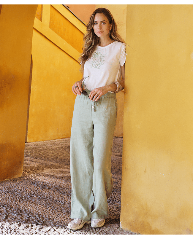 De combinatie van 100% linnen en de elastische tailleband met strik zorgt voor een ontspannen feel zonder in te leveren op uitstraling.