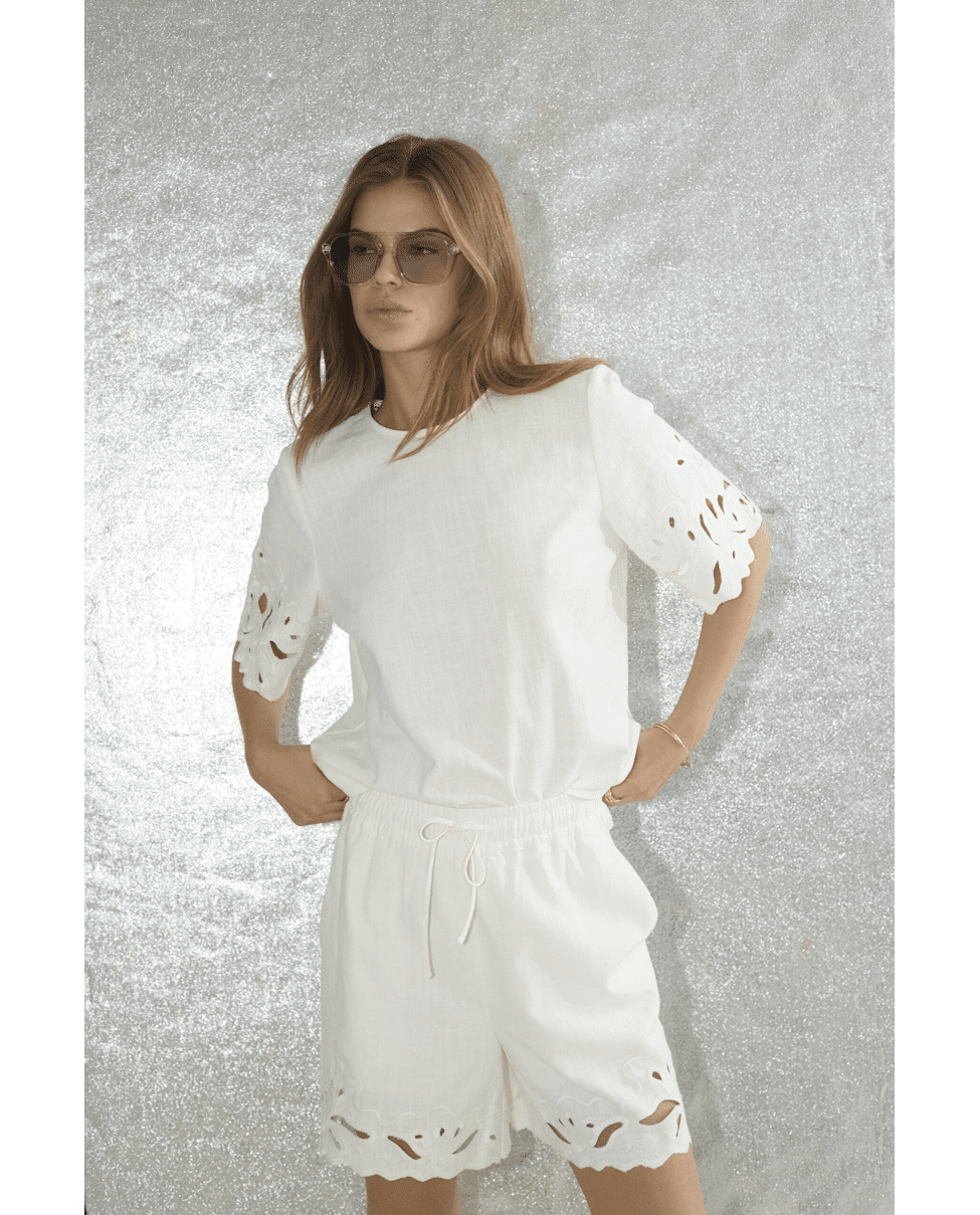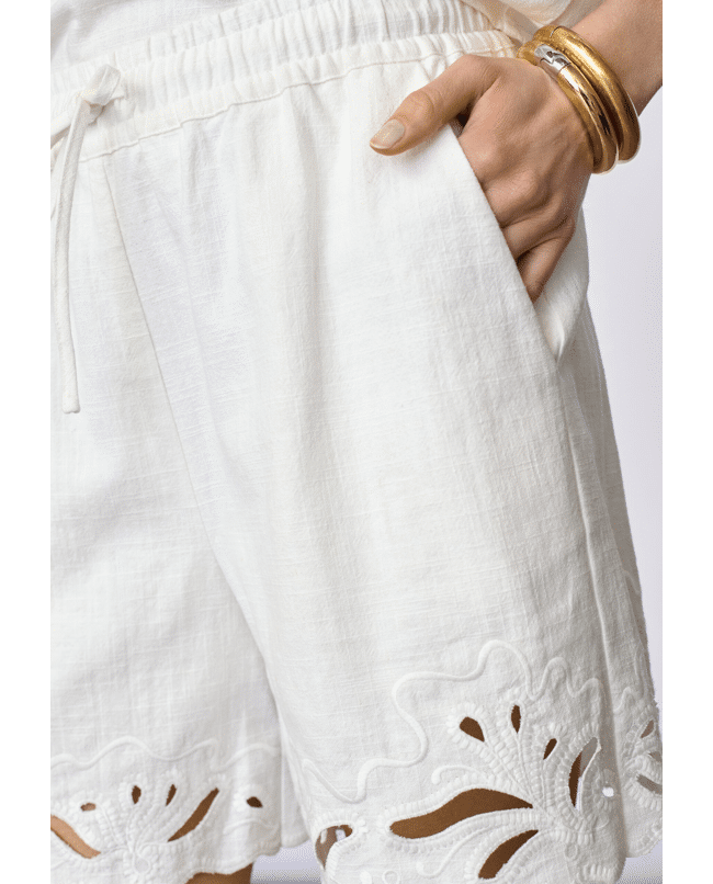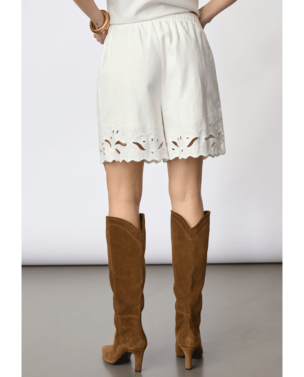 De geborduurde zoom geeft deze linnen short een romantische touch. Mooi met een luchtige blouse of simpel tanktopje.