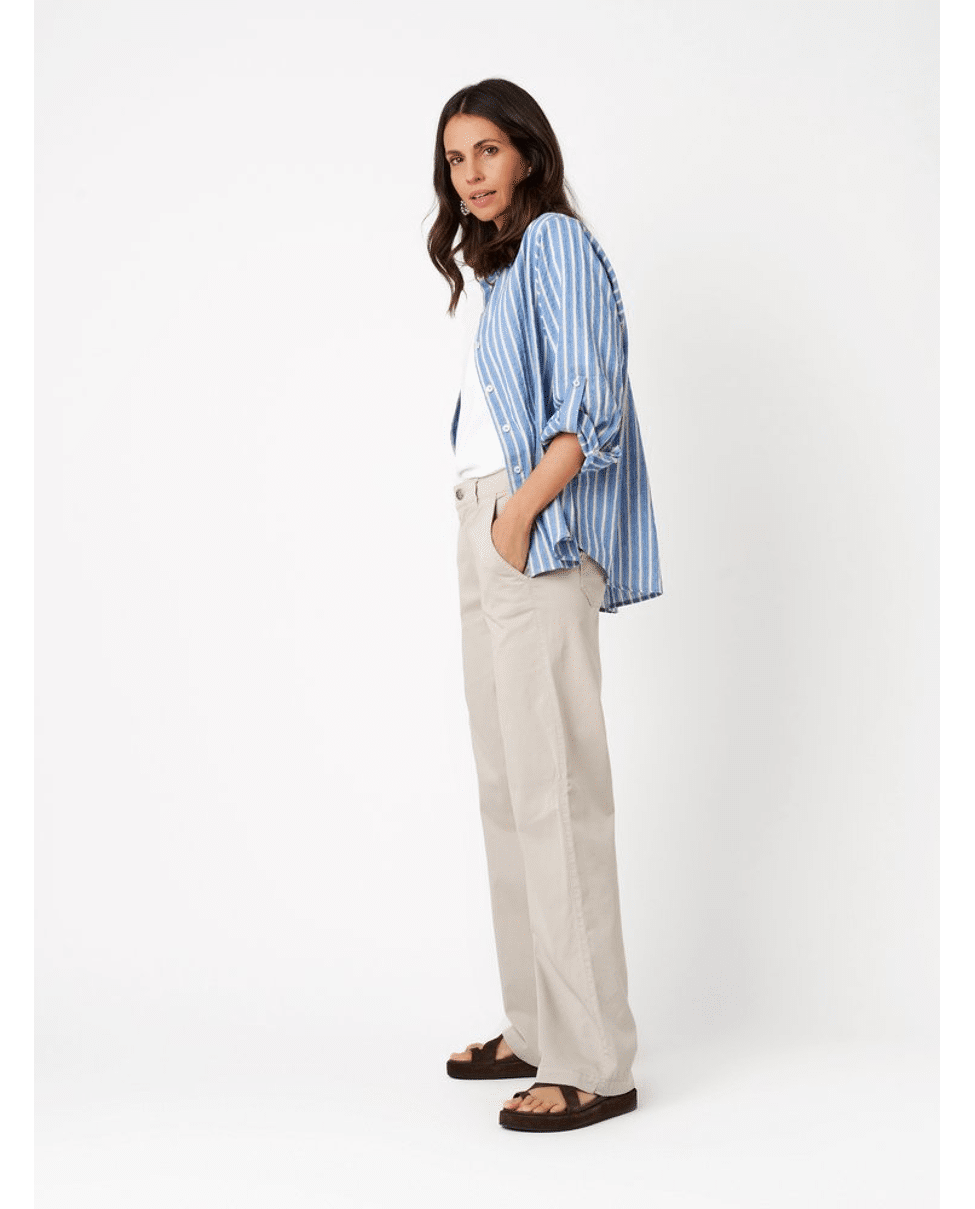Deze beige damesbroek van TONI heeft een moderne, rechte pasvorm en een rustige, tijdloze uitstraling. De zachte katoen-modal mix voelt comfortabel aan en maakt dit model ideaal voor dagelijks gebruik, van werk tot een casual dag in de stad.