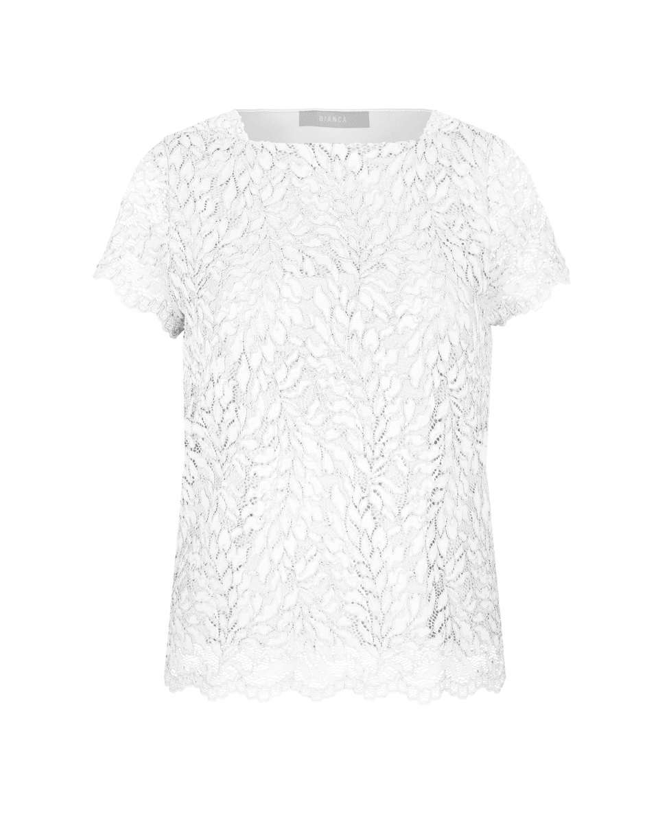 Het LOTTA dames T-shirt van BIANCA is een elegante basic met een verfijnde uitstraling. De rijke kantstructuur in fris wit geeft dit shirt een vrouwelijke en stijlvolle look – perfect voor zowel een feestelijke gelegenheid als een zomerse dag.