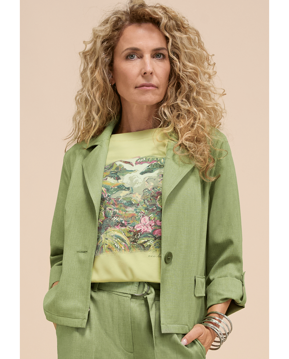 De LOUISA dames blazer van BIANCA in frisgroen is een stijlvolle toevoeging aan je voorjaarsgarderobe. De korte, licht getailleerde snit en de reverskraag geven deze groene damesblazer een moderne, vrouwelijke uitstraling. Perfect als set met de bijpassende pantalon of los op een jeans.