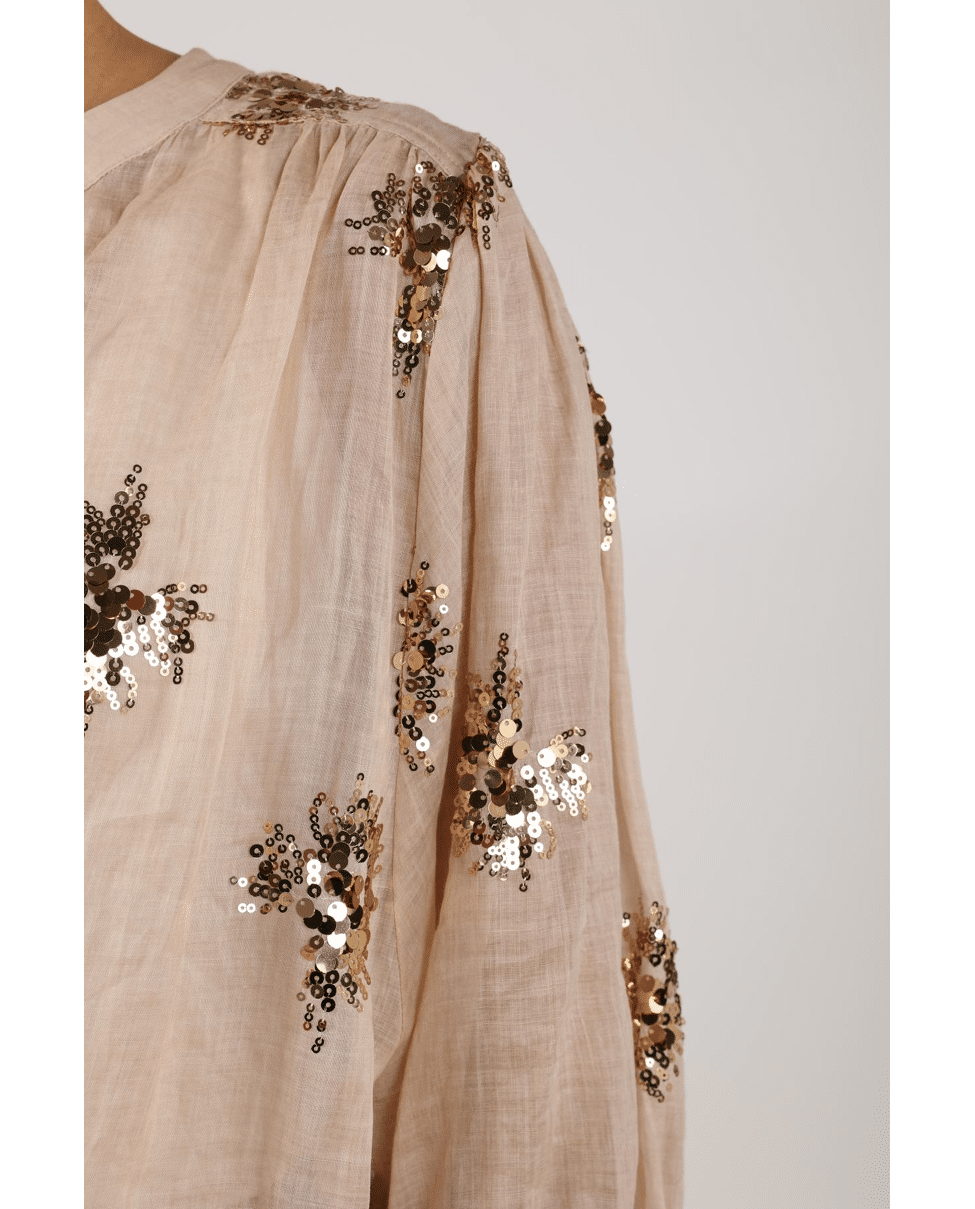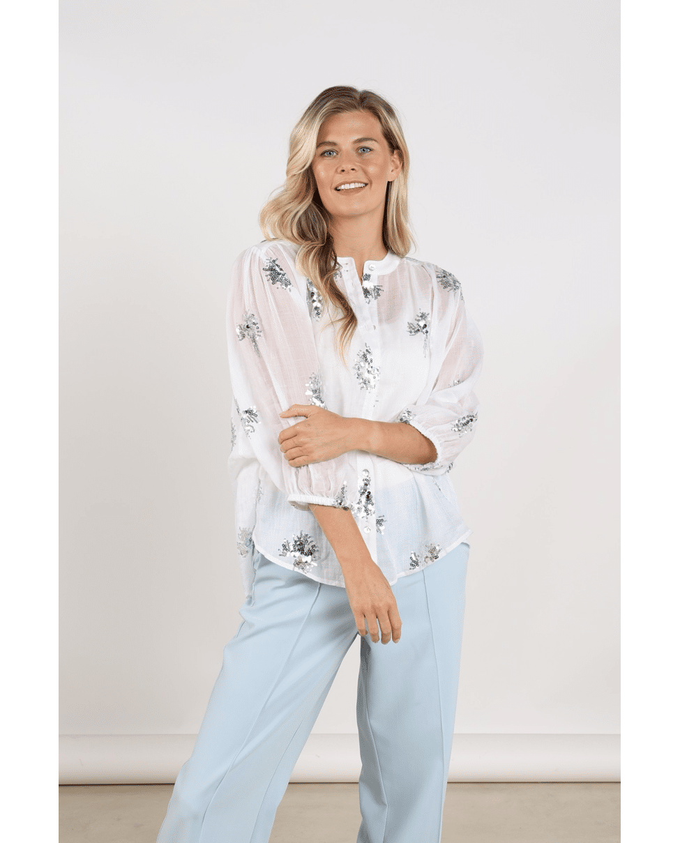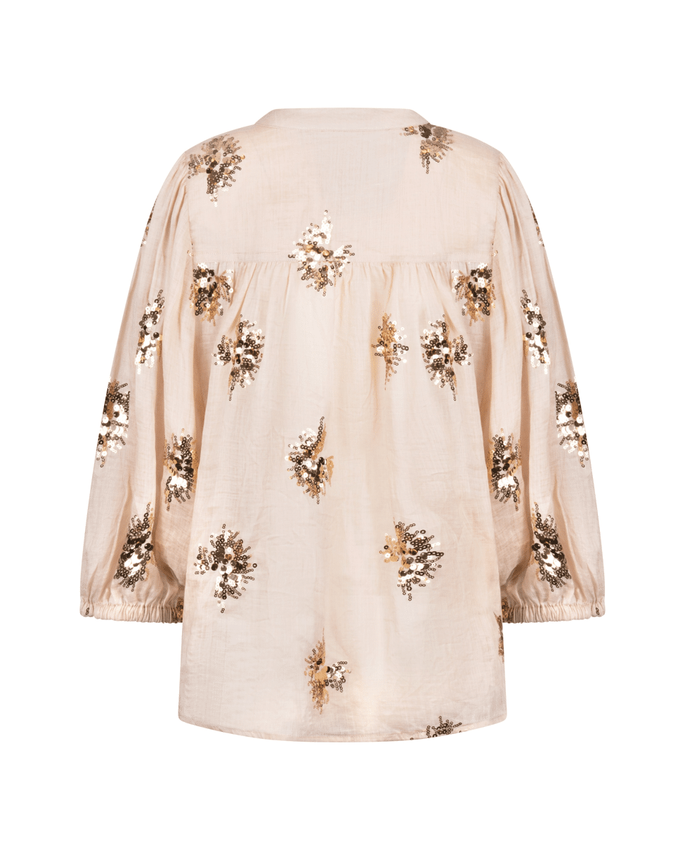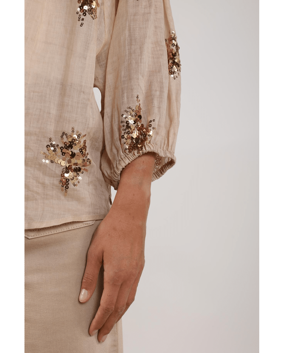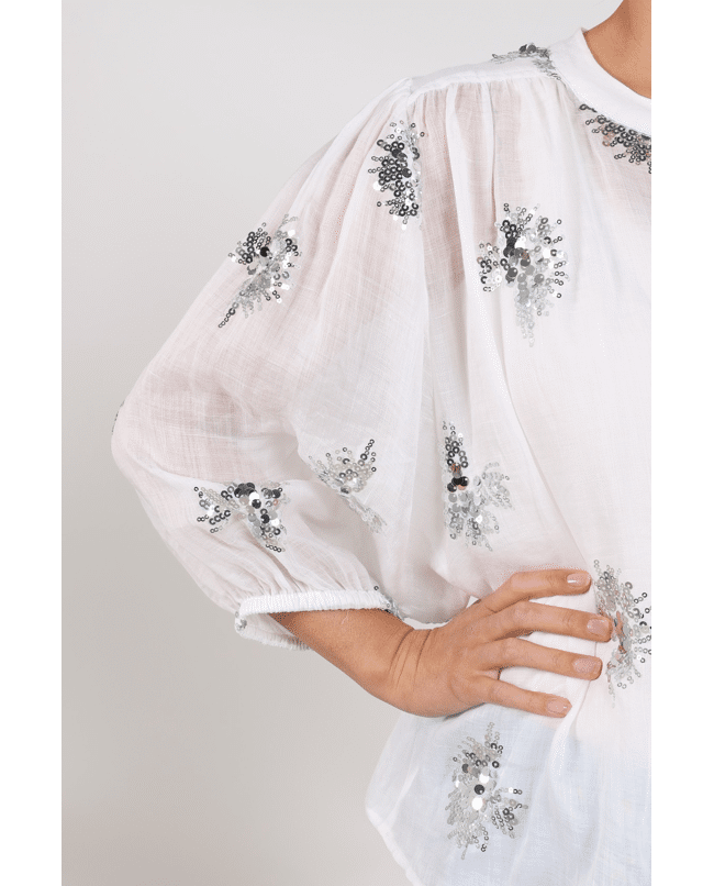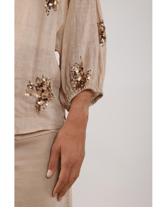 De handgestikte pailletten geven de blouse een unieke, ambachtelijke look – subtiel fonkelend in het licht.