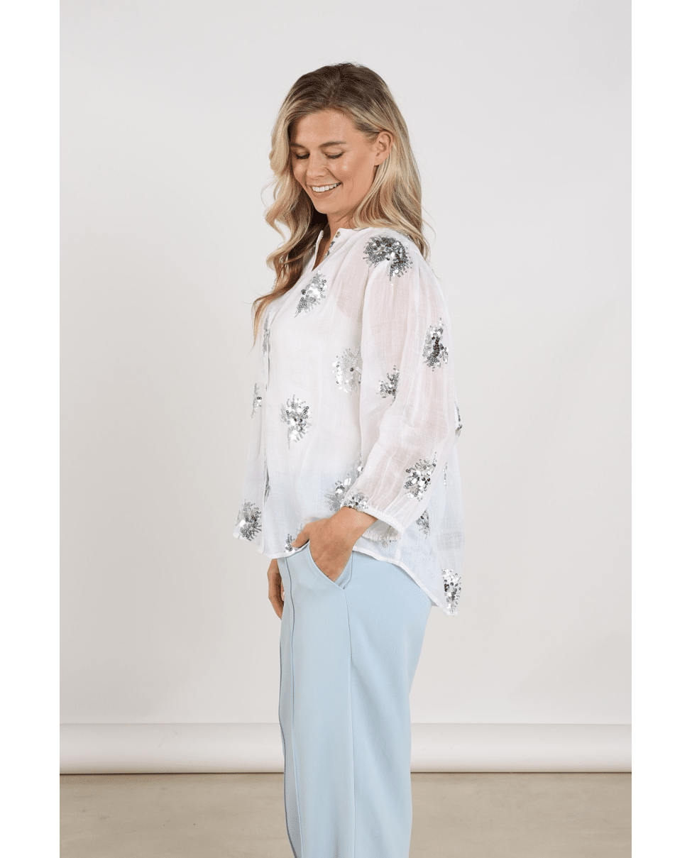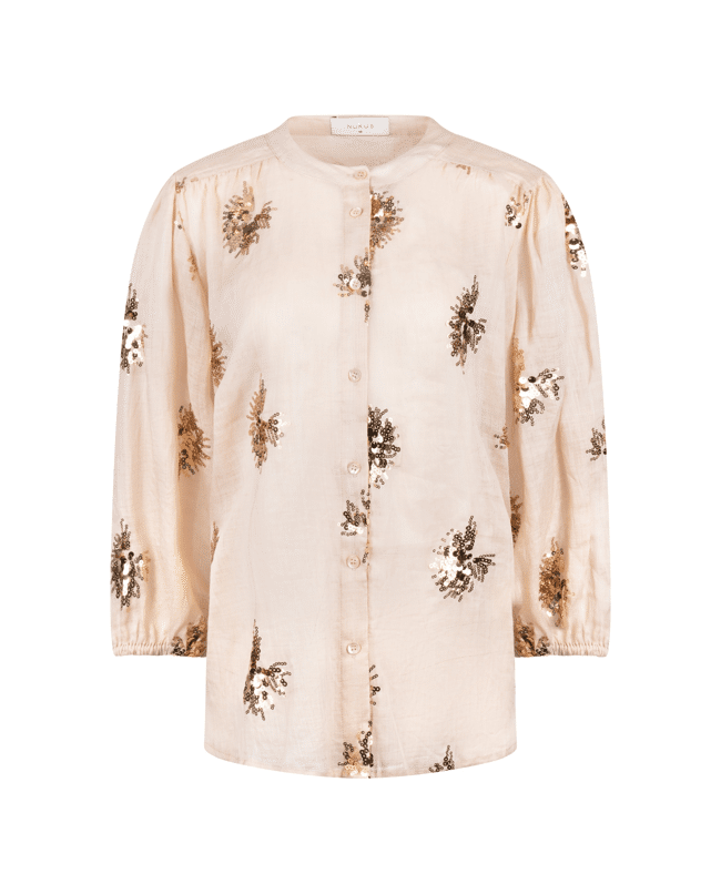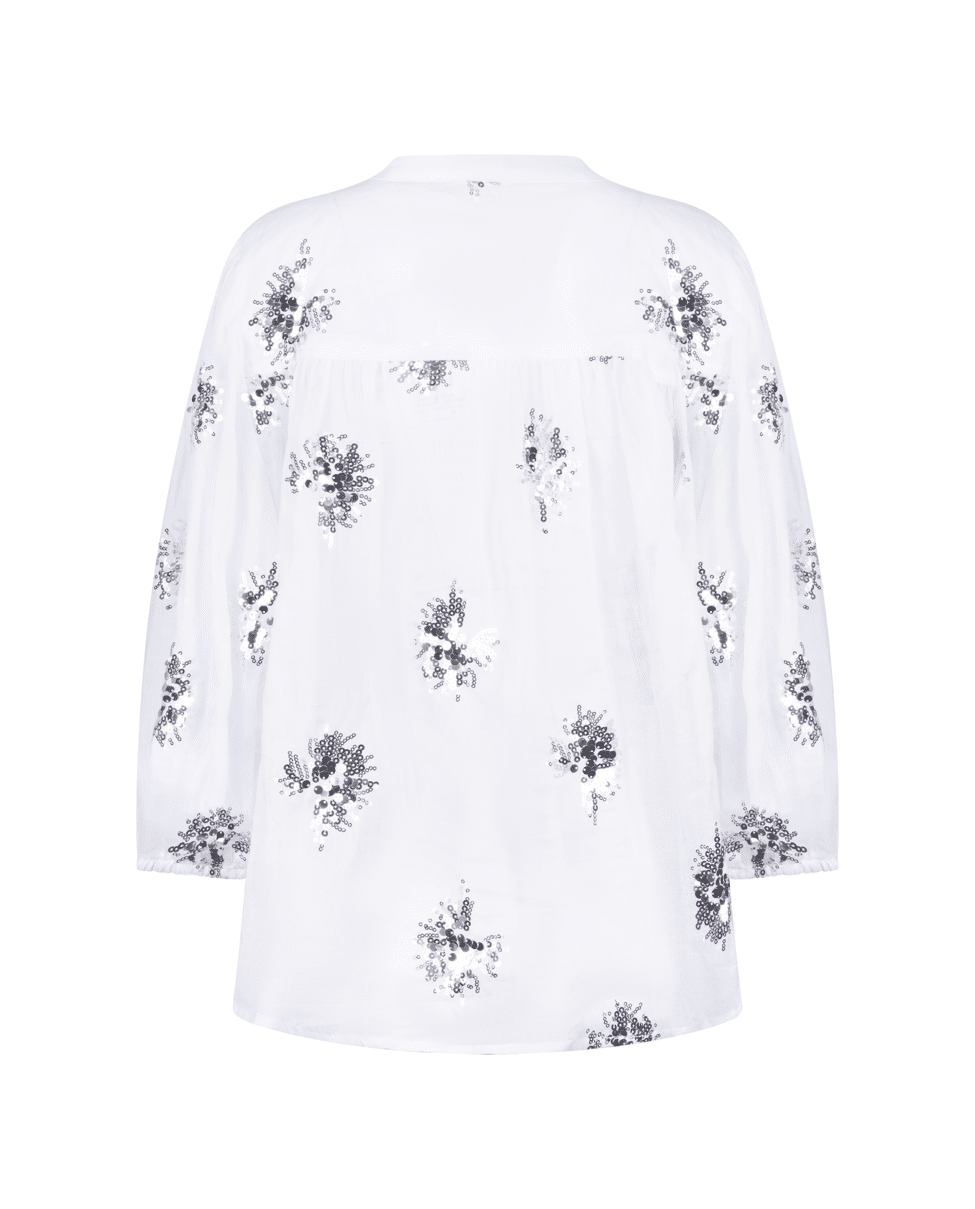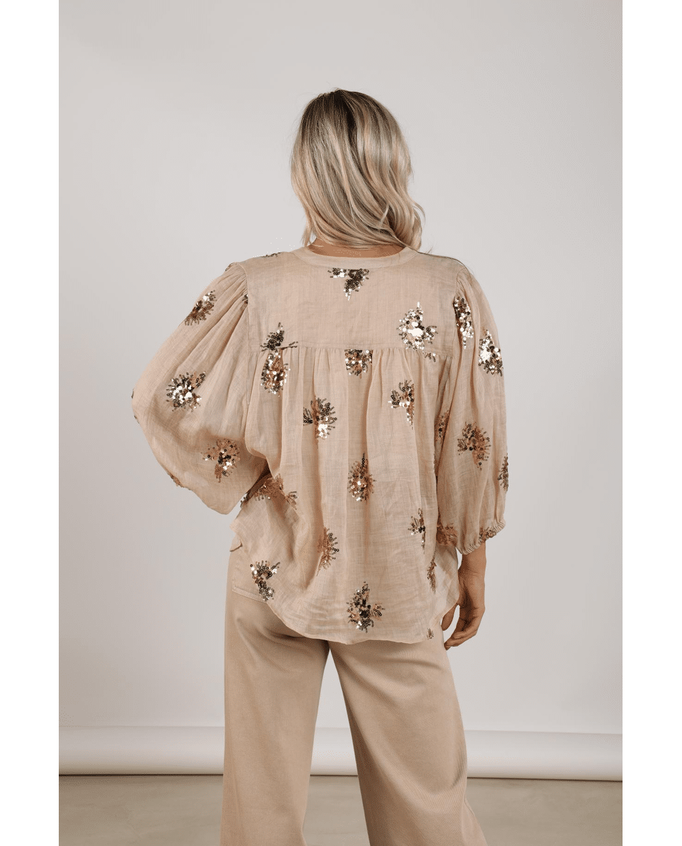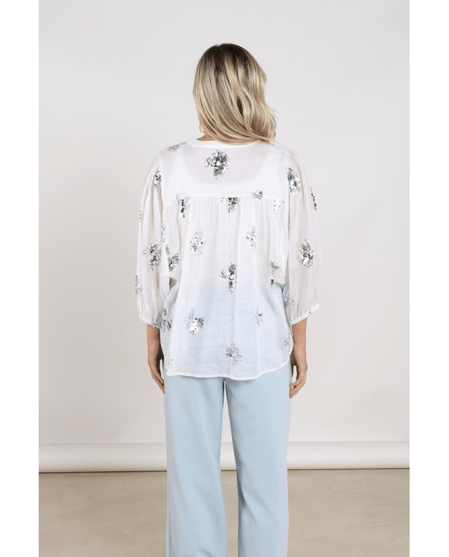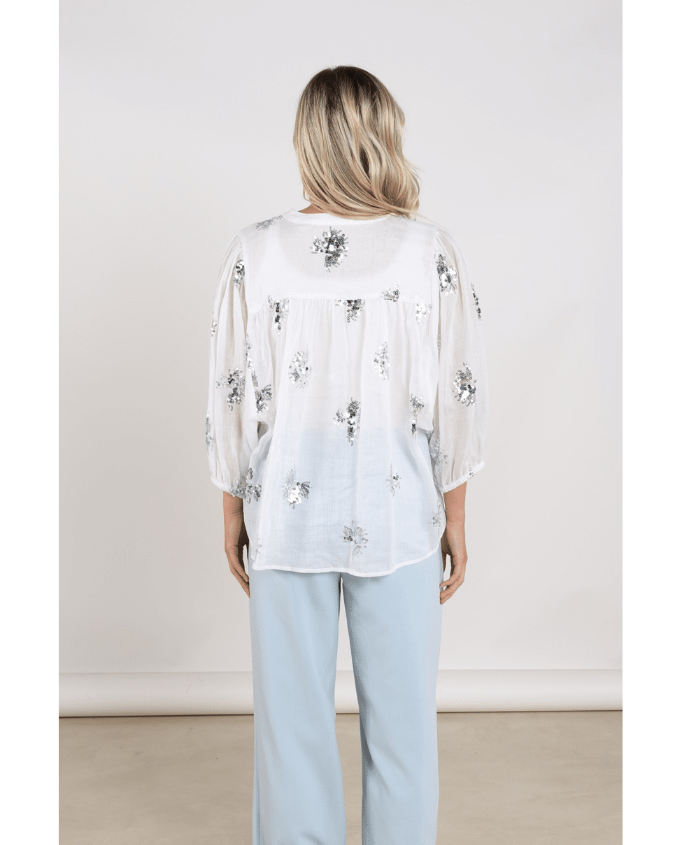 De handgestikte pailletten geven de blouse een unieke, ambachtelijke look – subtiel fonkelend in het licht.