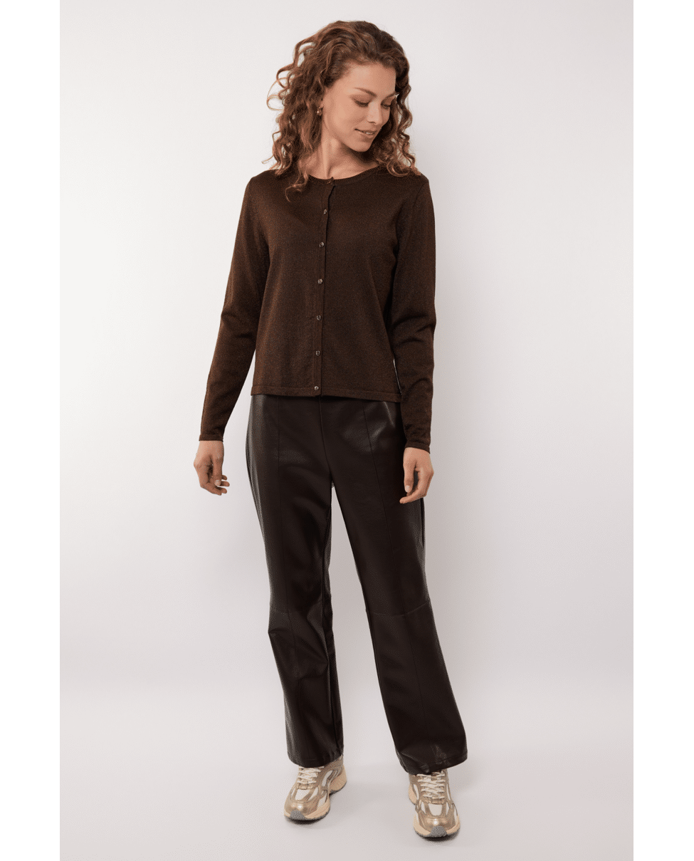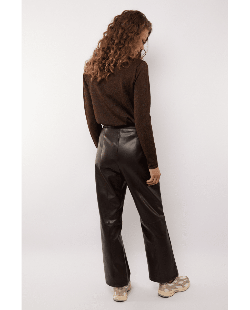 De coating geeft deze broek een leerlook, zonder in te leveren op comfort — ideaal met knitwear of een blouse.