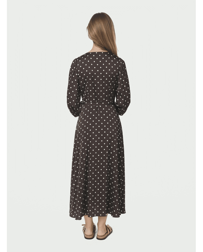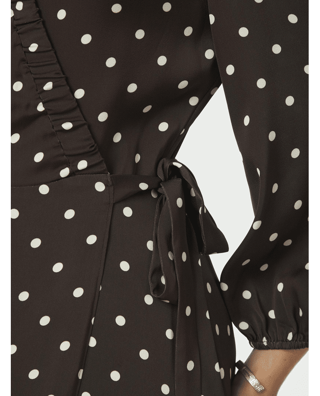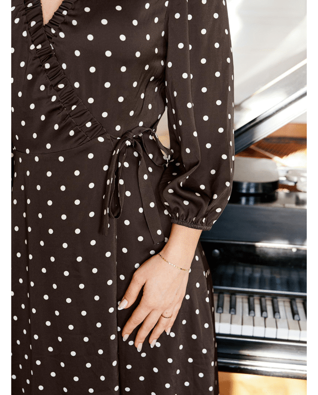 De subtiele ruches langs de halslijn geven de jurk een speelse, verfijnde touch. Het stippenpatroon in bruin met crème maakt deze jurk klassiek, maar toch helemaal van nu.